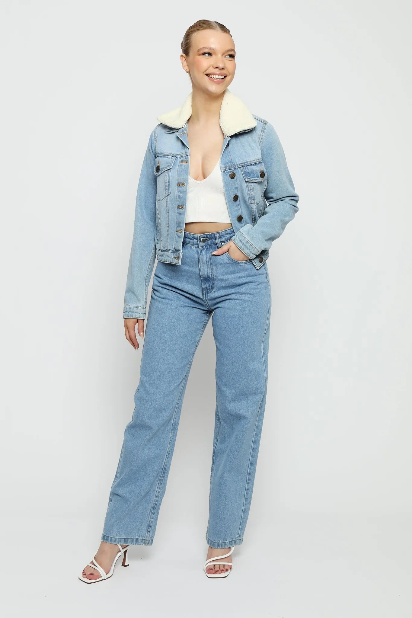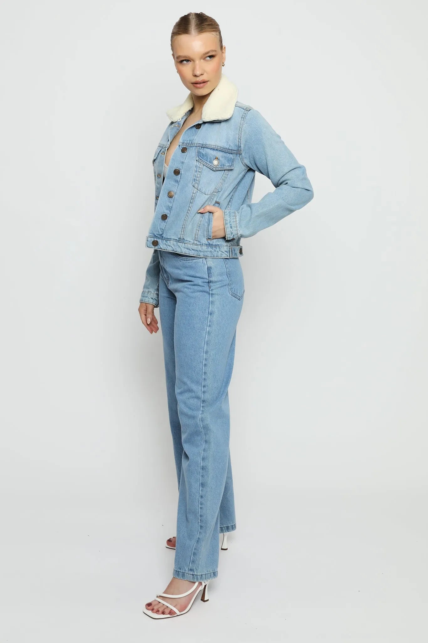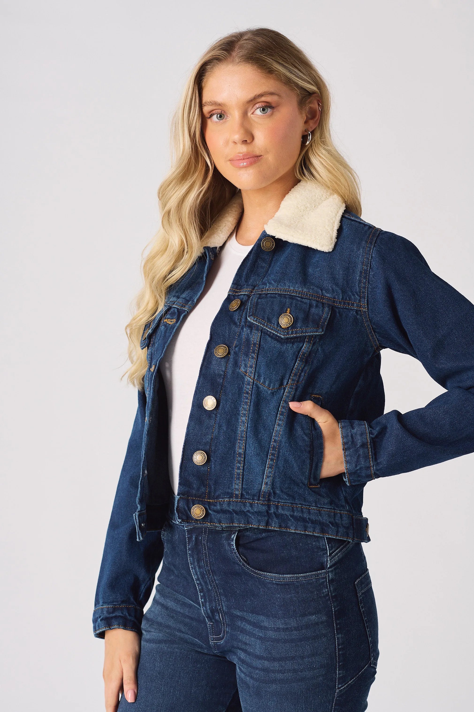 Frost Sherpa Collar Denim Jacket – Mid Blue