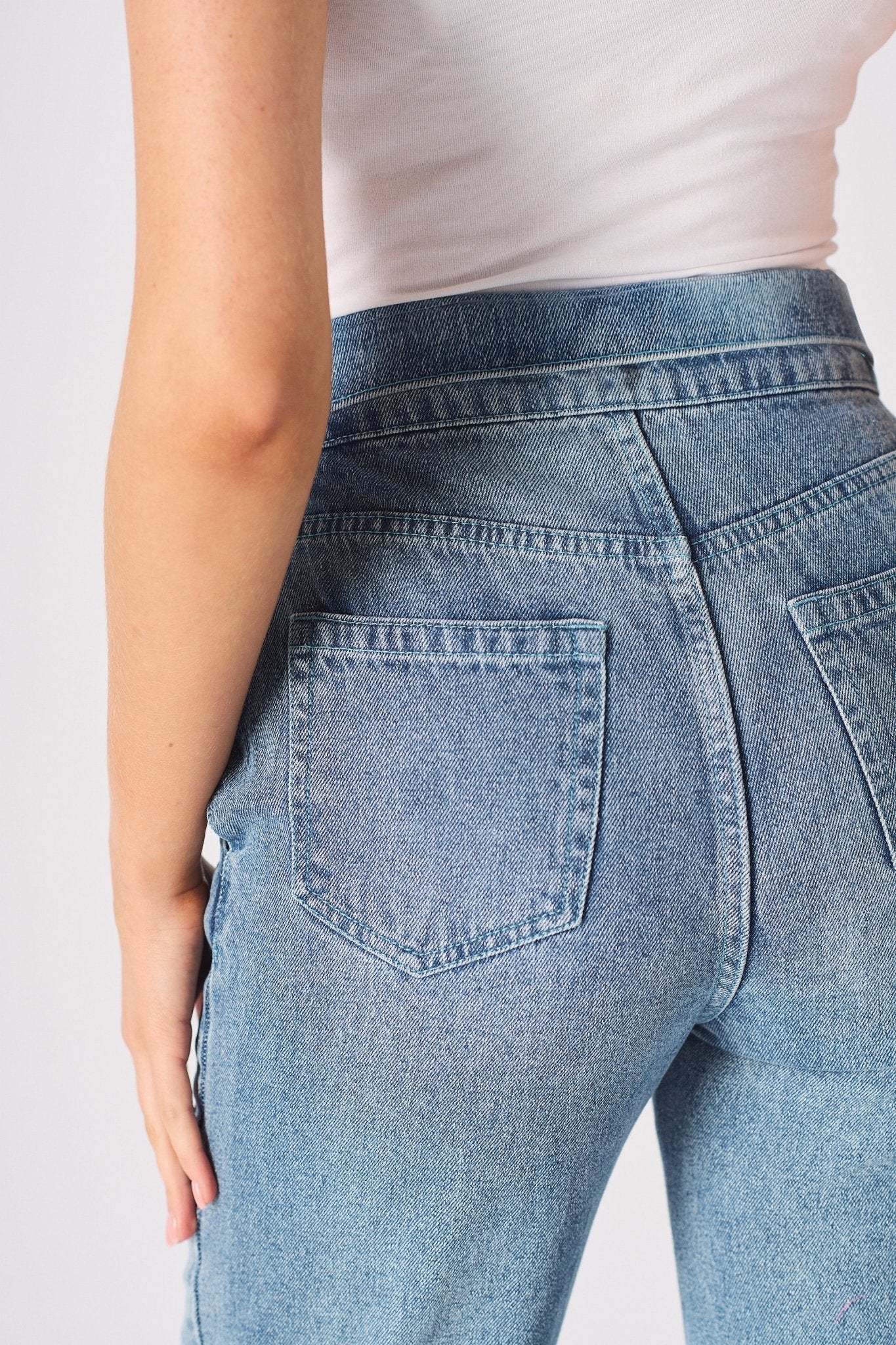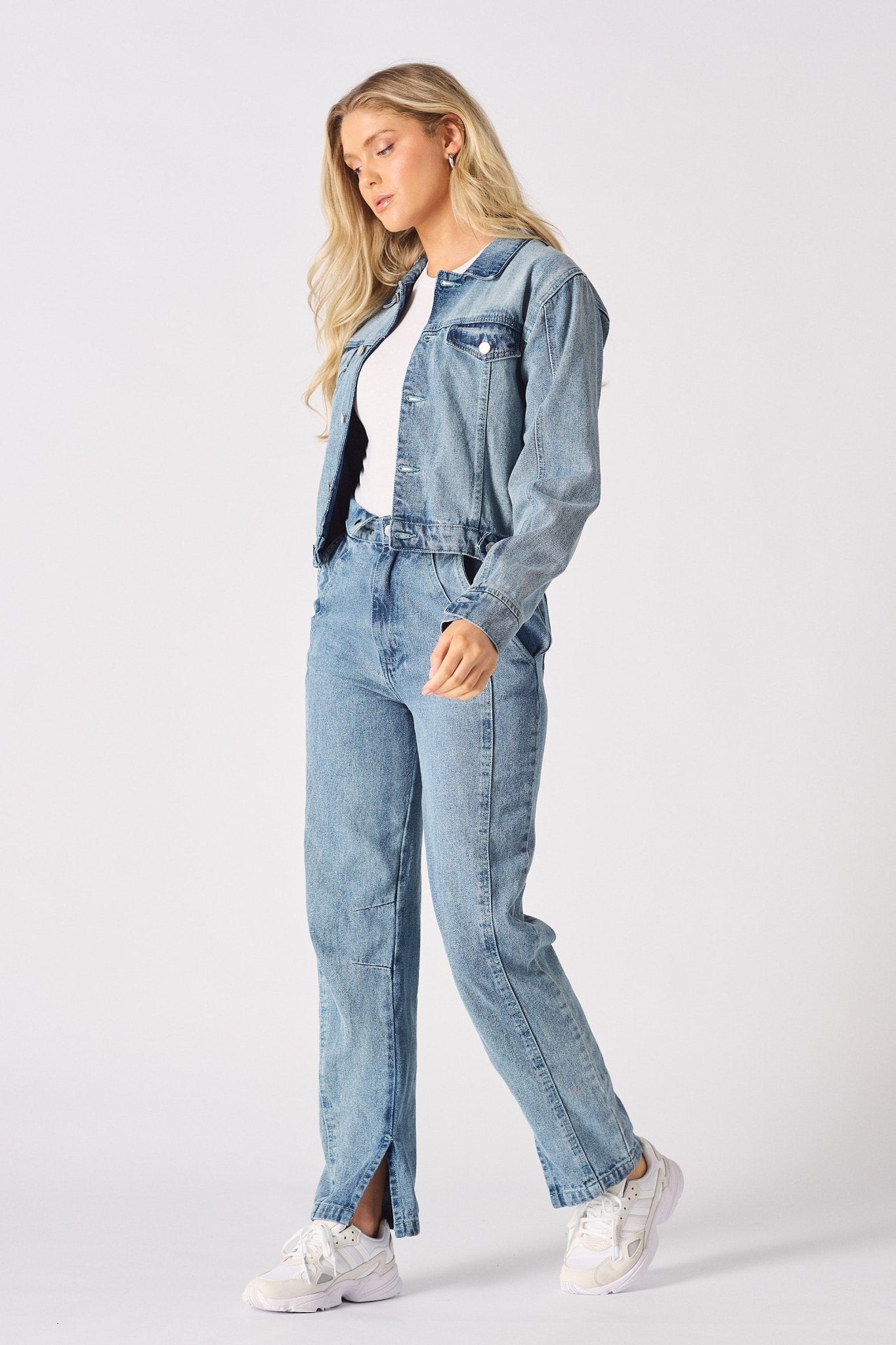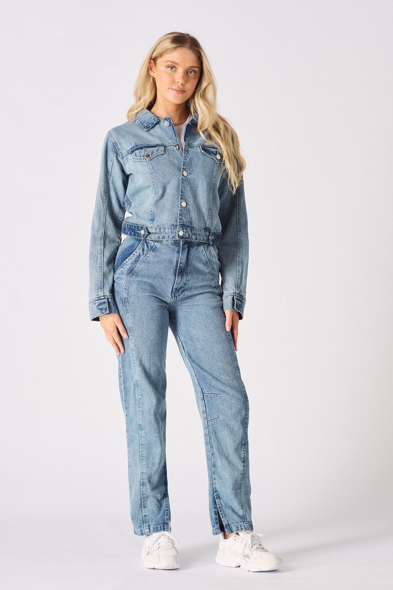 This isn't a jumpsuit; it's something even better. This two-piece set features a cropped denim jacket and matching mom jeans, perfectly coordinated to create the illusion of a single, stylish jumpsuit when worn together. The high-waisted mom jeans are designed with a relaxed fit, distinctive front seams, and contemporary ankle slits. The matching jacket has a classic cropped cut that meets the jeans perfectly at the waist. Both pieces are crafted from blue acid wash denim and can be worn together for a bold co-ord look or styled separately for endless wardrobe options.