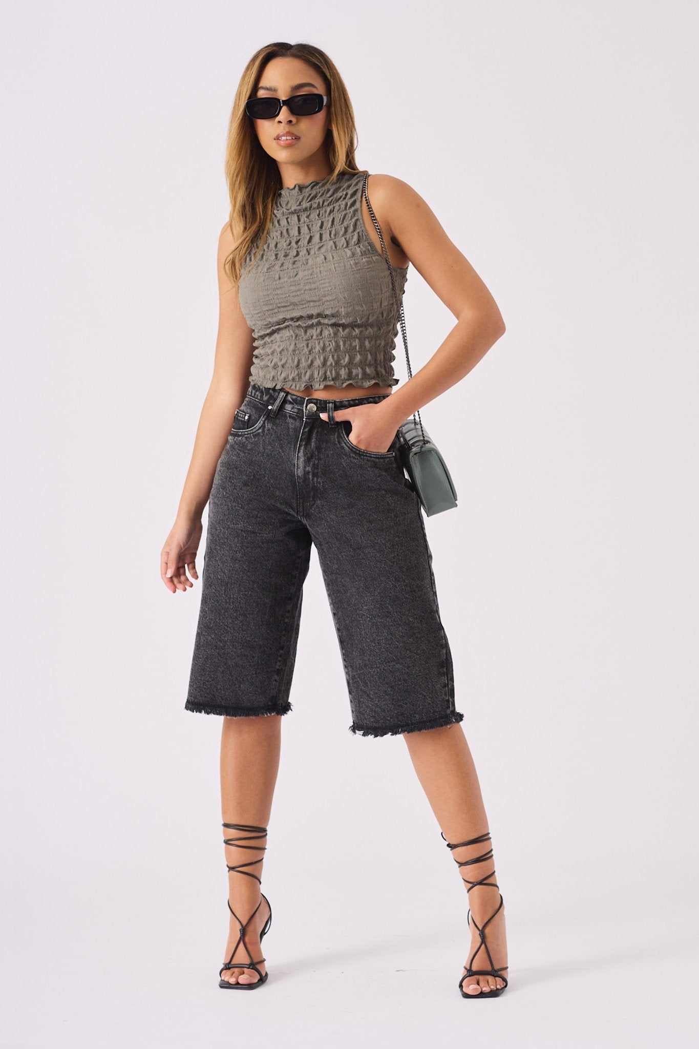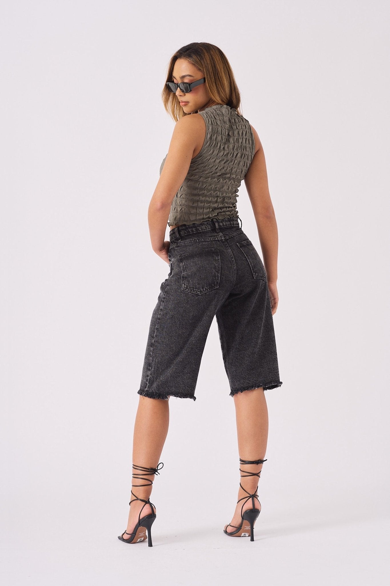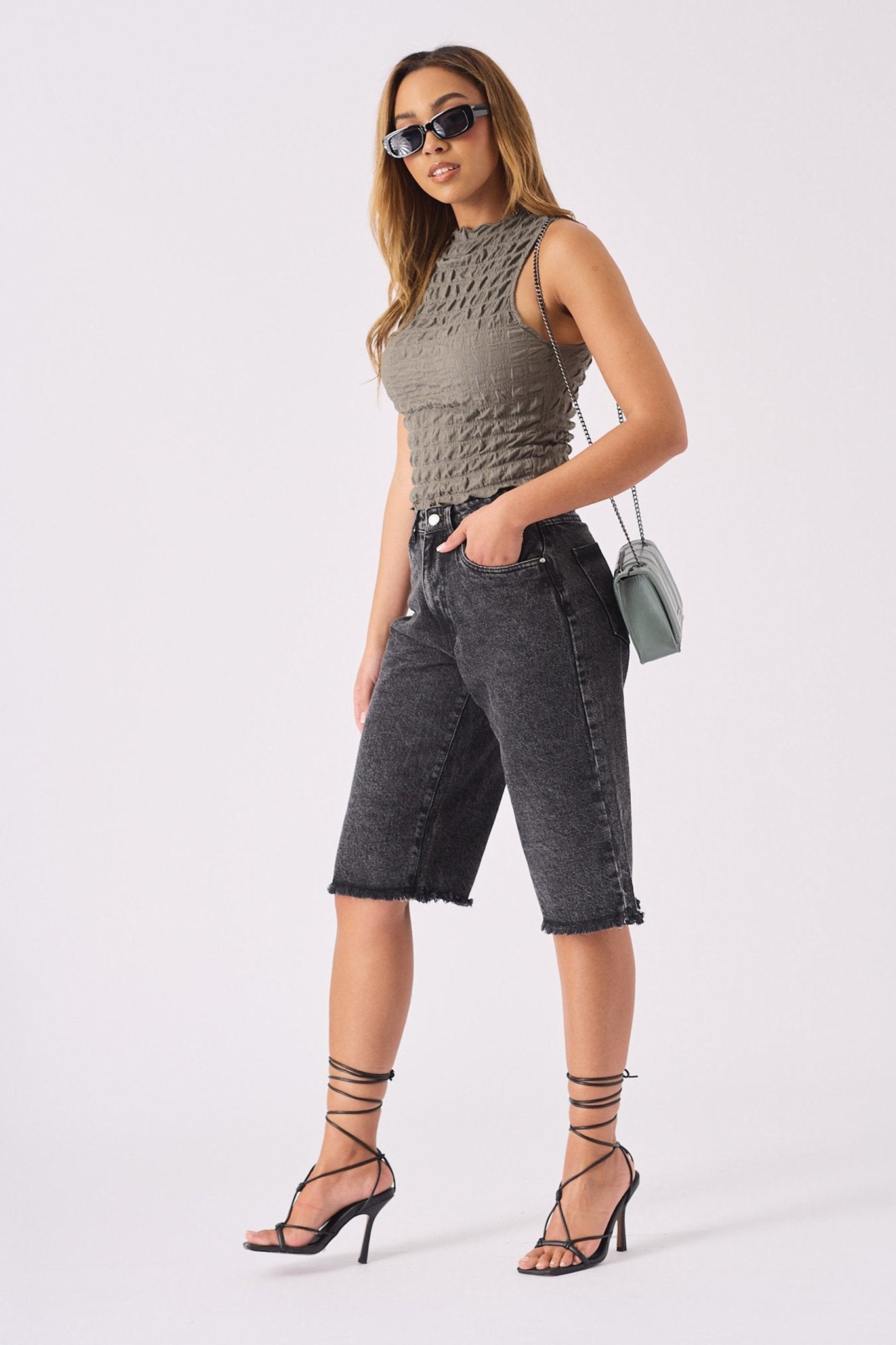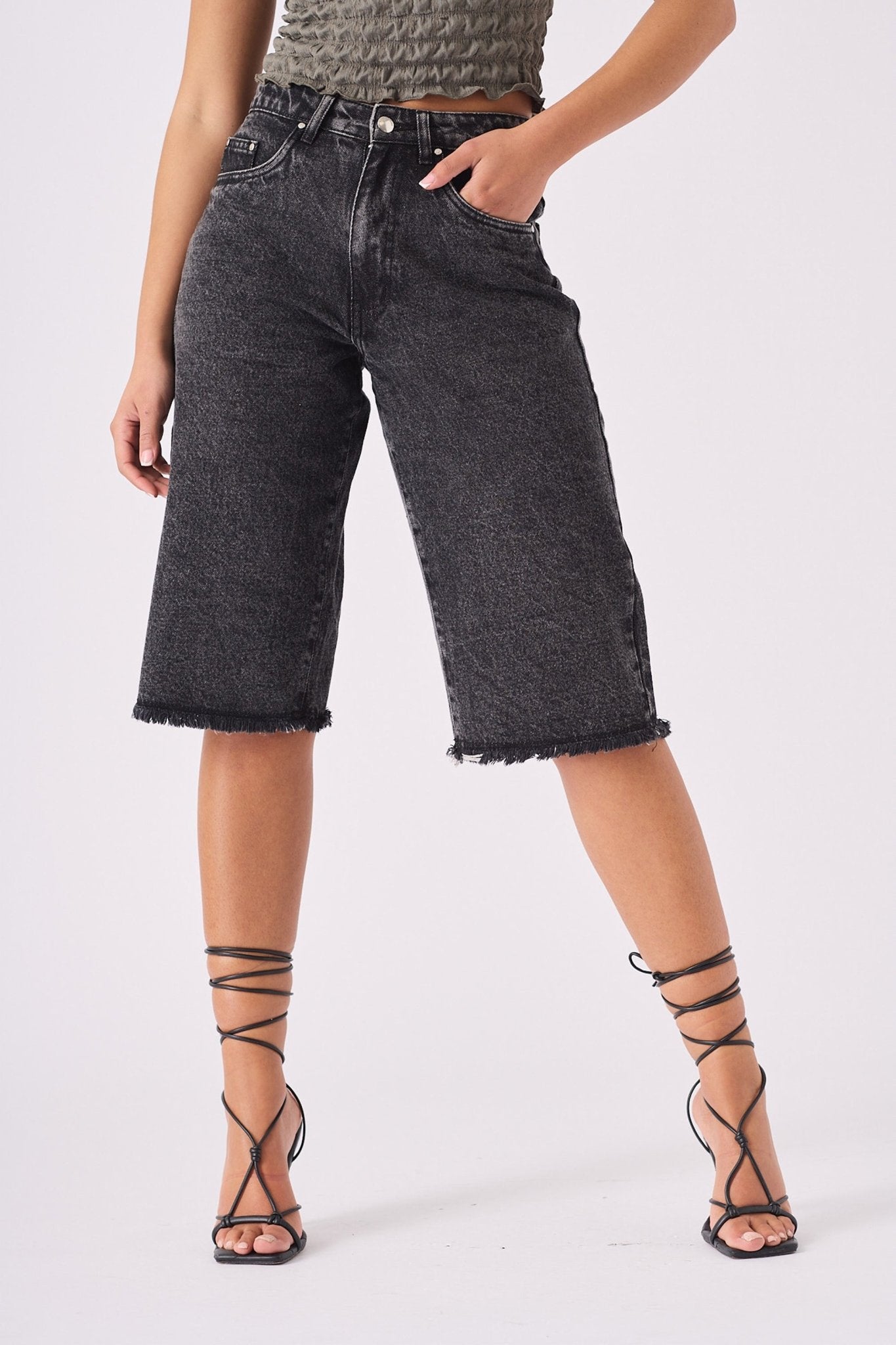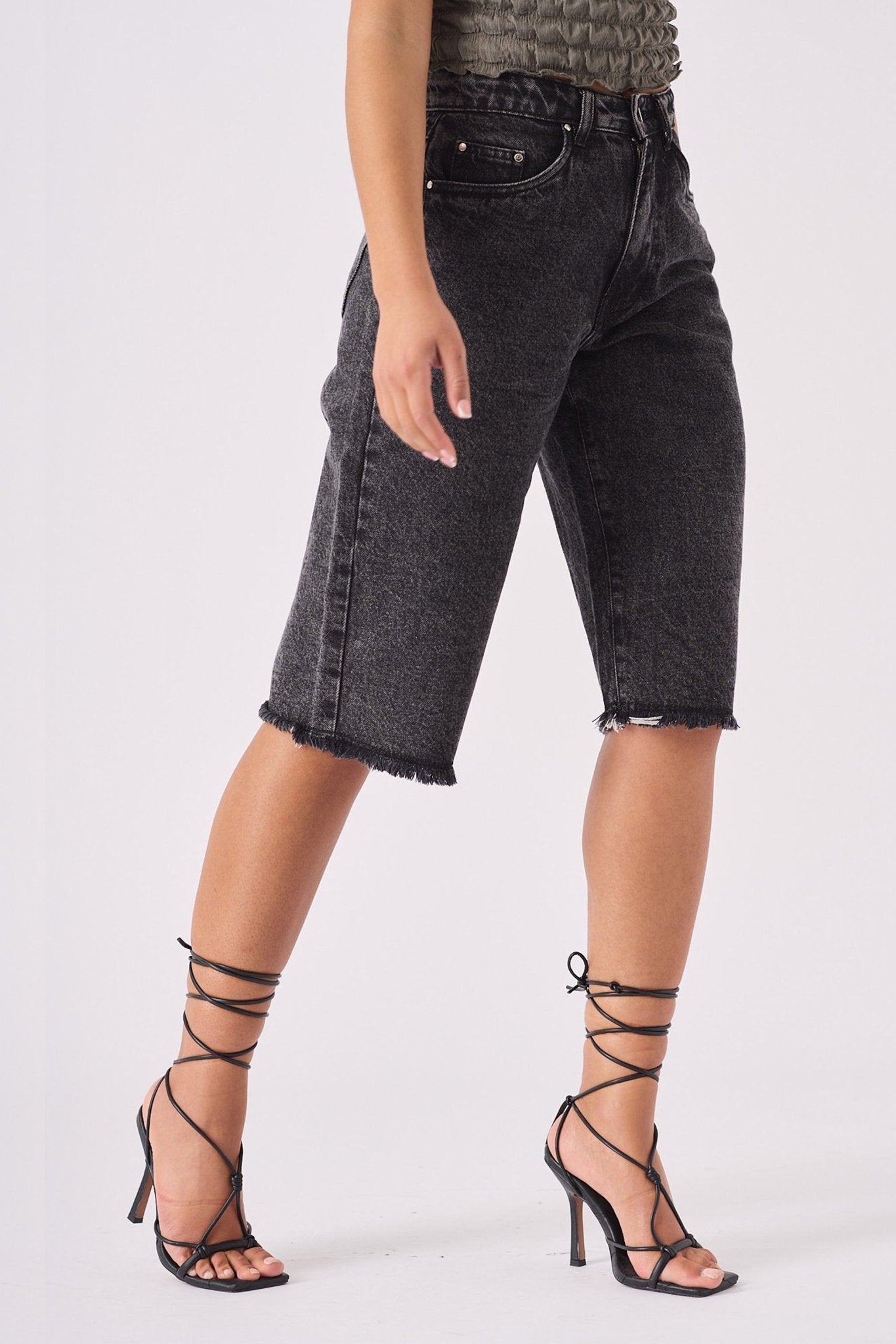A modern wardrobe needs a standout pair of shorts, and these black acid wash jorts are the perfect fit. Cut in a contemporary longline silhouette that rests around the knee, they feature a high-waisted design for a flattering shape. The black acid wash finish and raw, frayed hem give them a cool, edgy vibe. Complete with a classic five-pocket setup and belt loops, these shorts are a versatile foundation for any fashion-forward look.