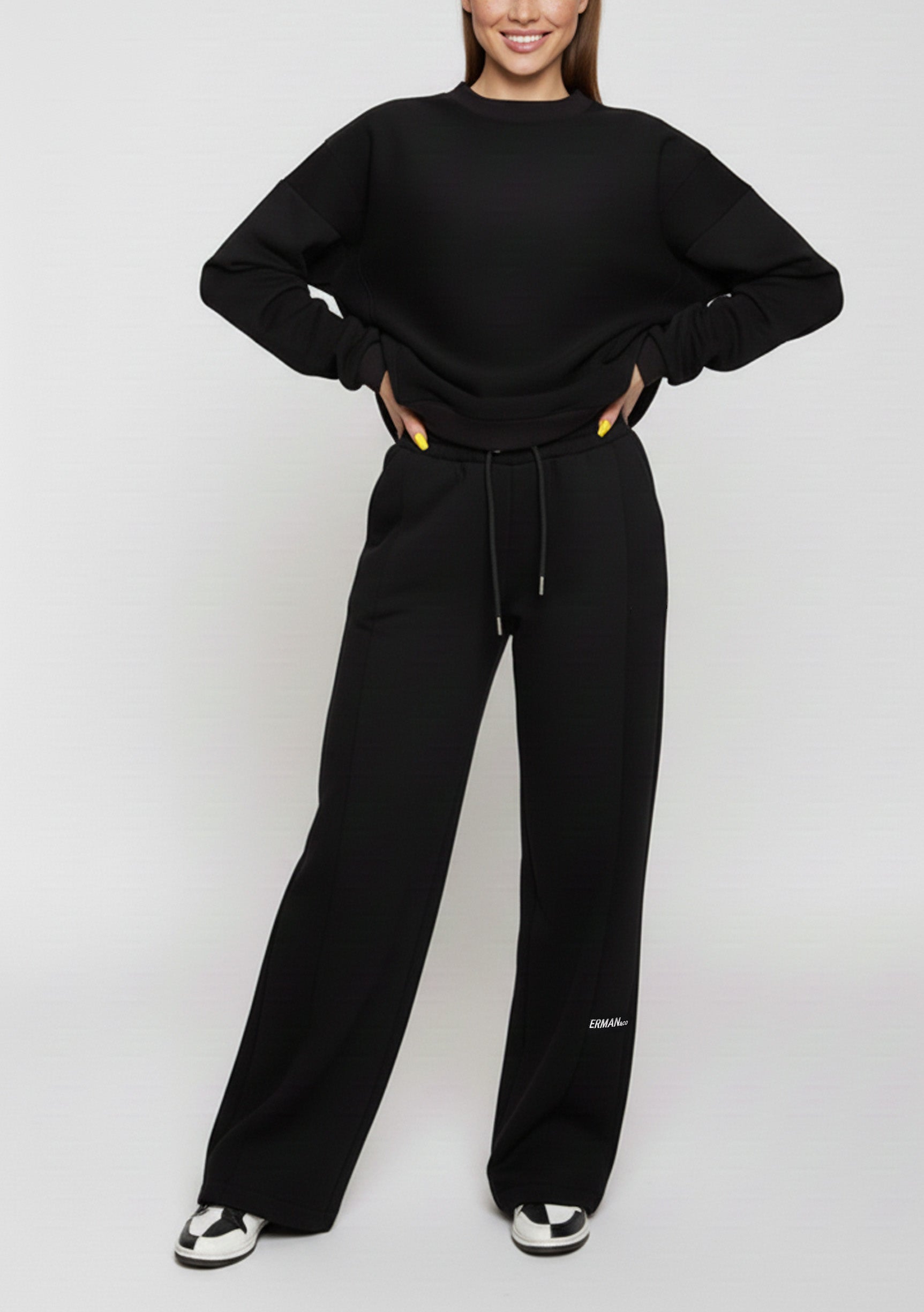 These black wide leg joggers womens style are made from a premium dual textured fabric to give you a sophisticated look. A subtle embroidered insignia serves as a quiet hallmark, embodying an elevated lifestyle where elegance and ease coexist.