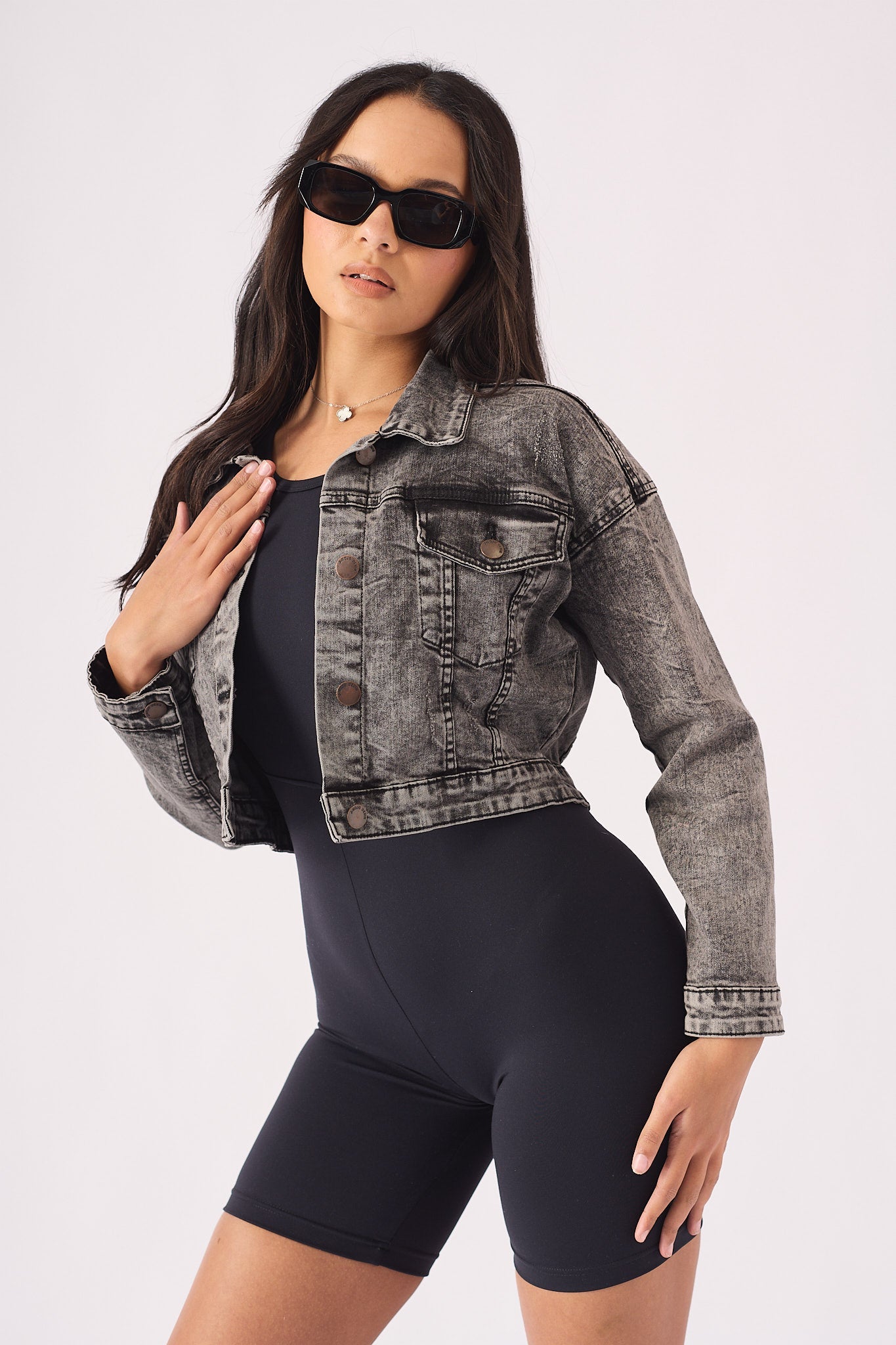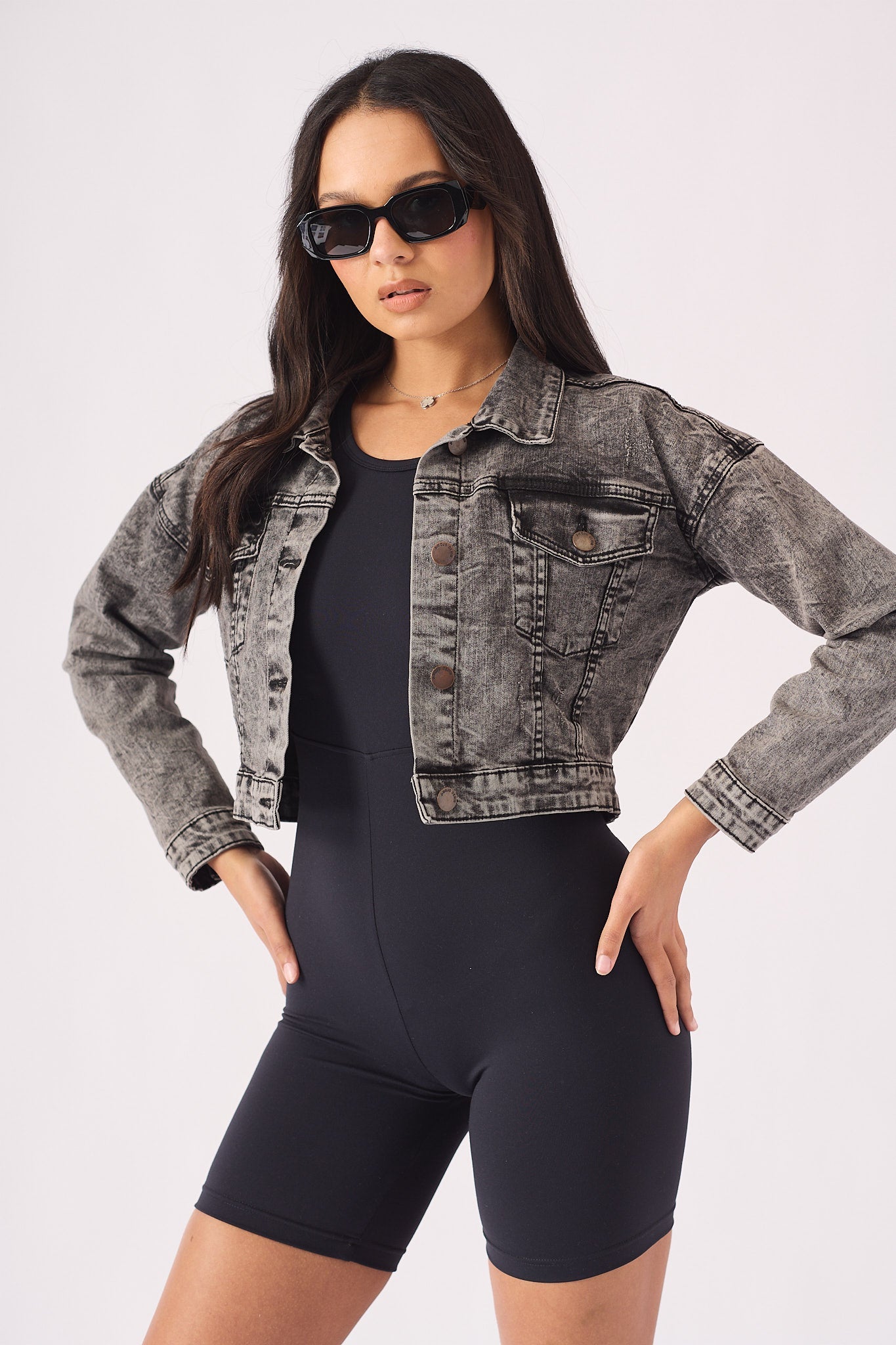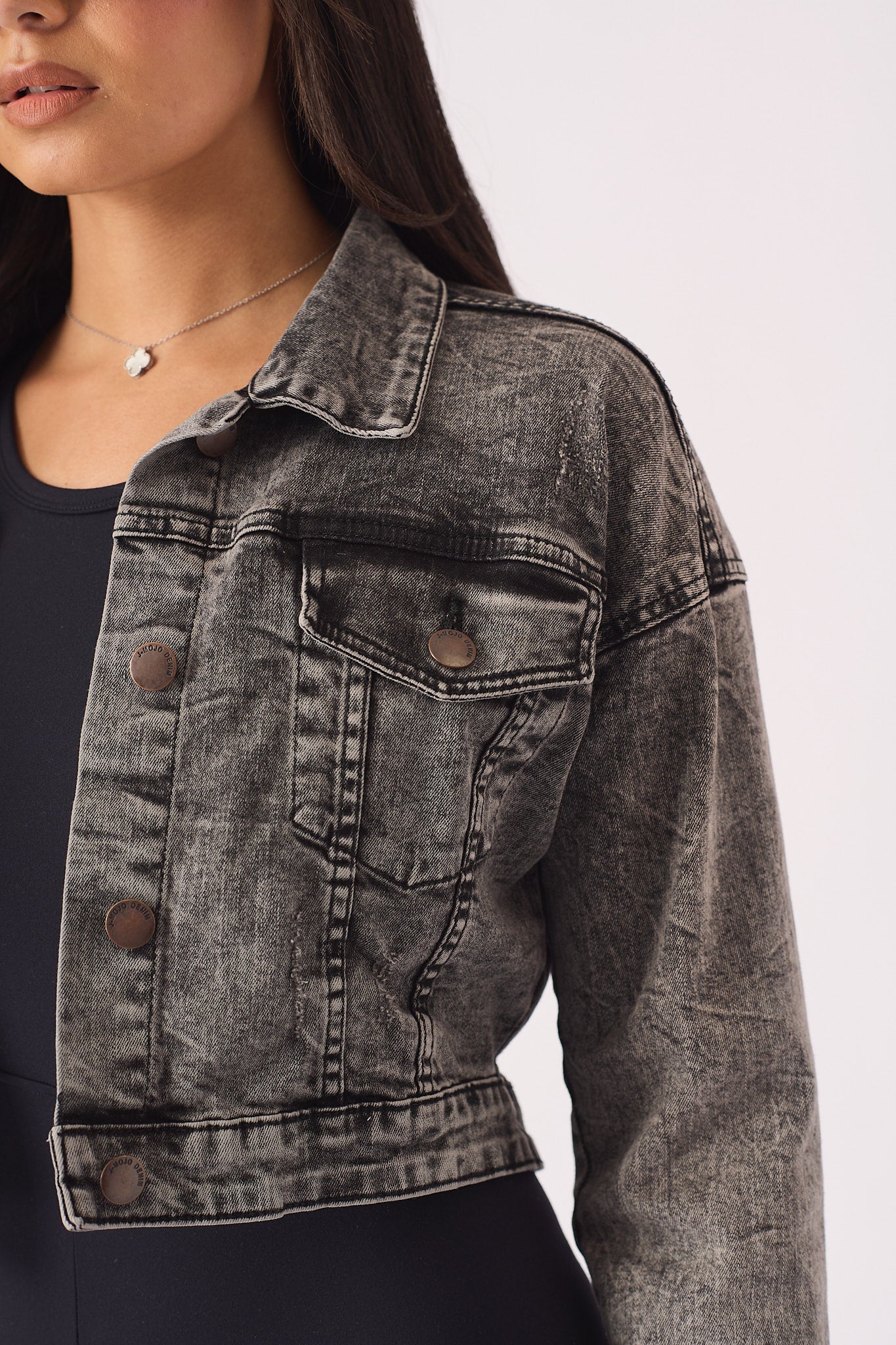 A modern wardrobe staple, this cropped denim jacket features a striking black acid wash. The classic trucker silhouette is updated with a shorter length, making it a versatile layering piece. Crafted from durable cotton, it's perfect for adding an edge to any outfit.