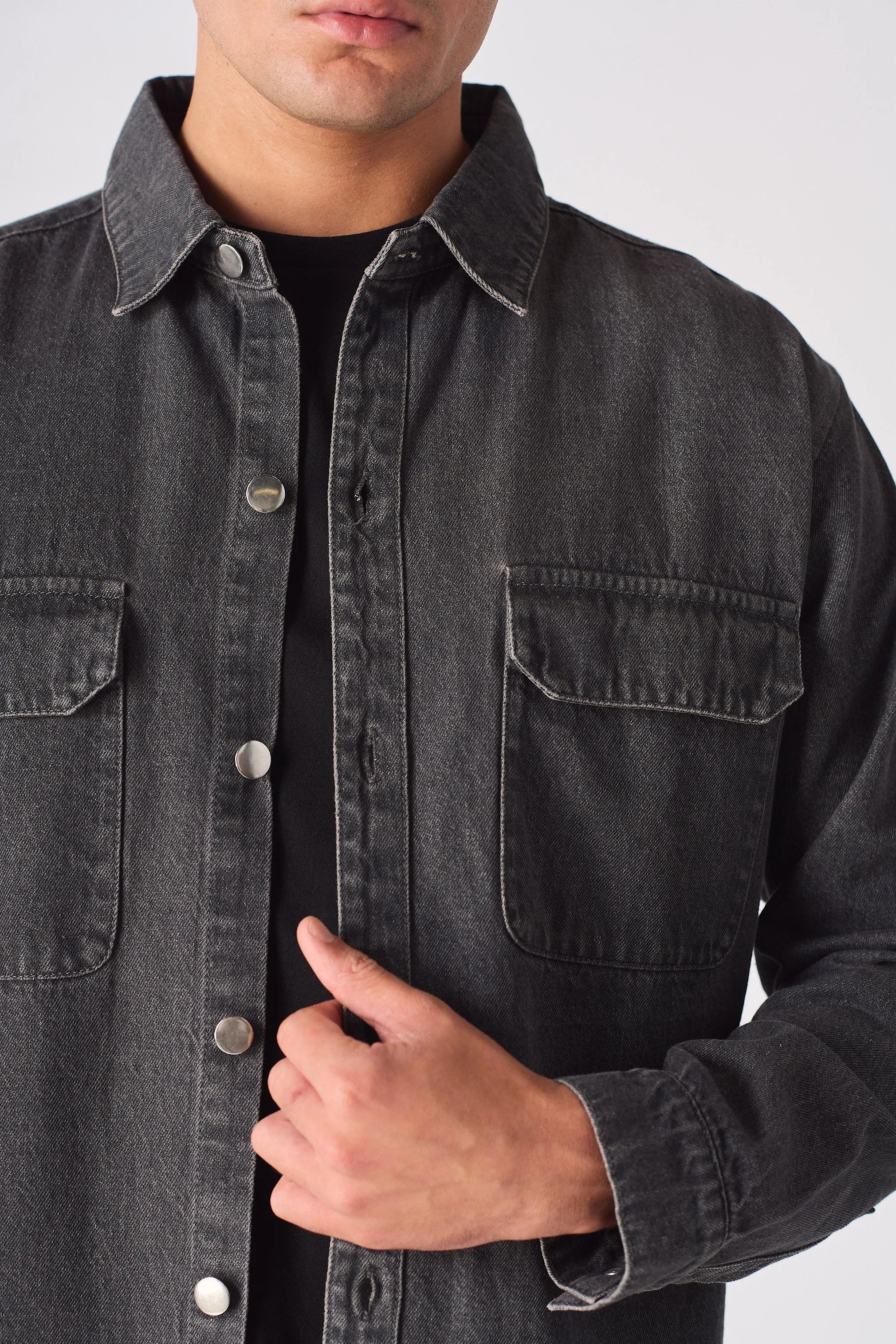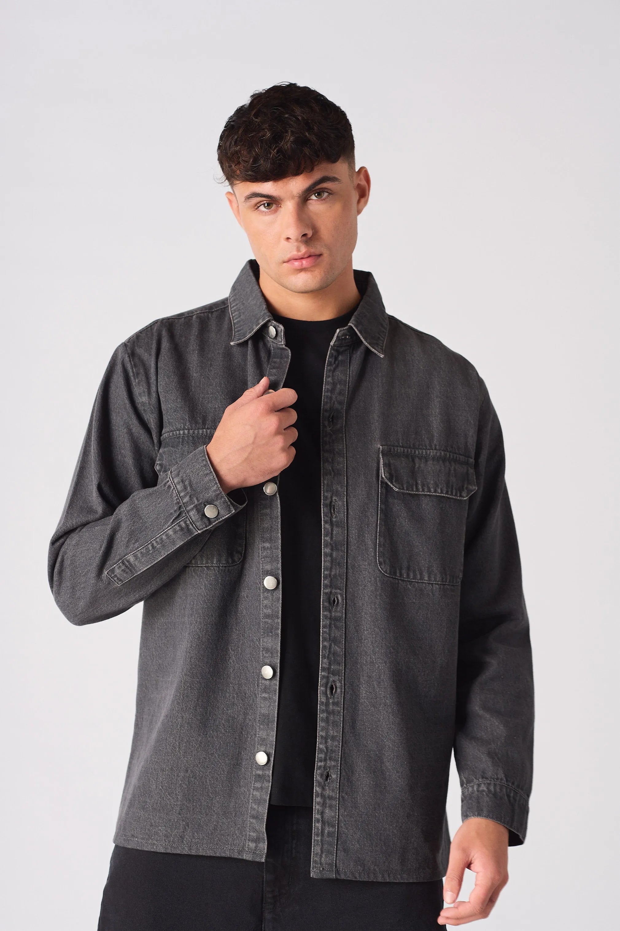 This grey wash denim overshirt is a versatile layering piece. Made from durable cotton, it features a relaxed fit and practical cargo-style chest pockets. The classic button-front design makes it an ideal 'shacket' for a modern, utilitarian look.