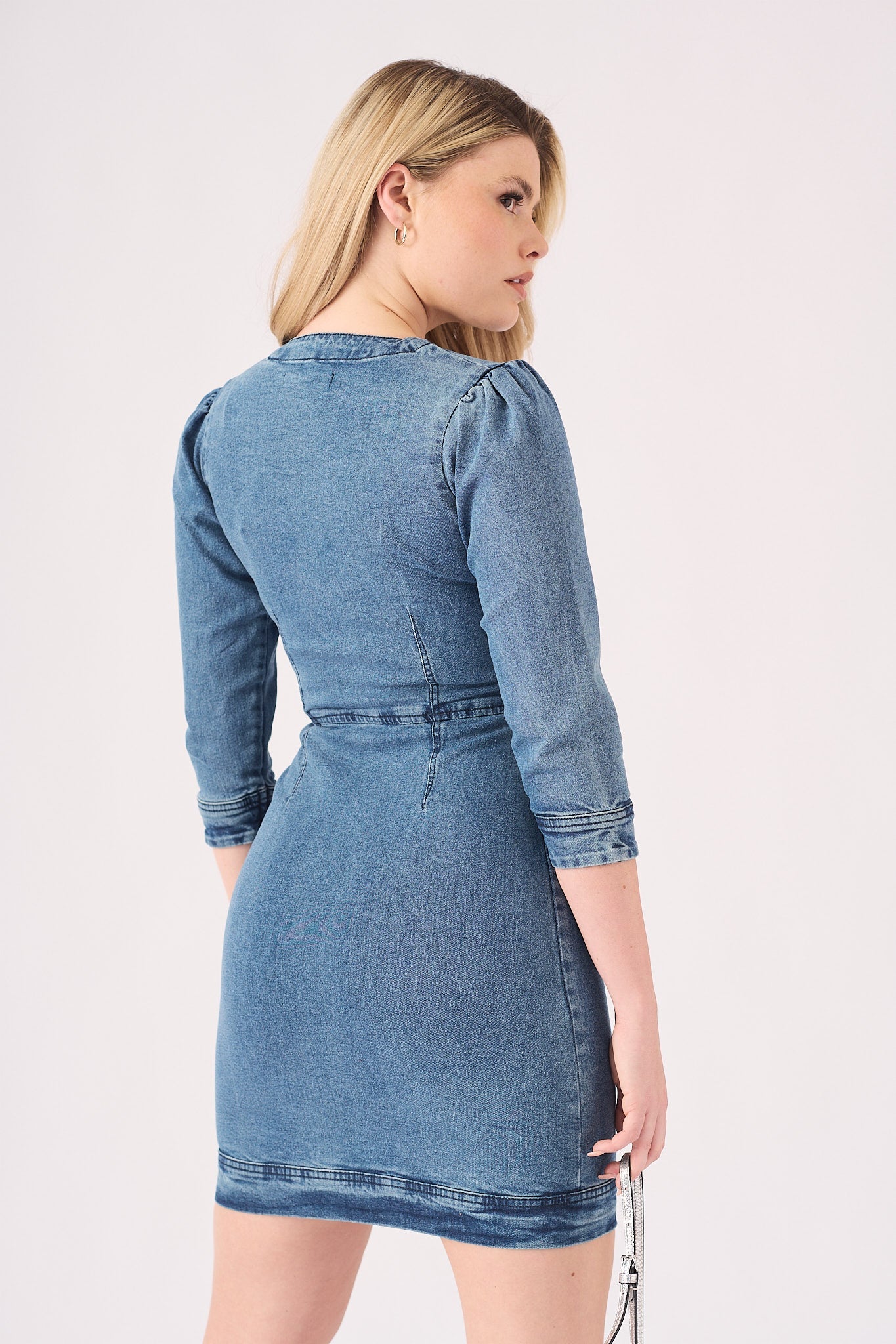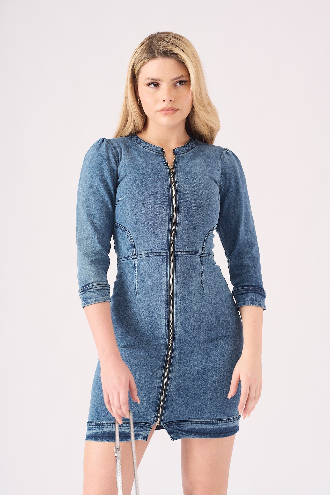 This figure-hugging denim dress is designed to flatter. Shown in a classic mid-blue wash, its standout feature is a full-length zip that runs down the front. Crafted from stretch denim with structured puff sleeves, it's a modern and stylish choice.