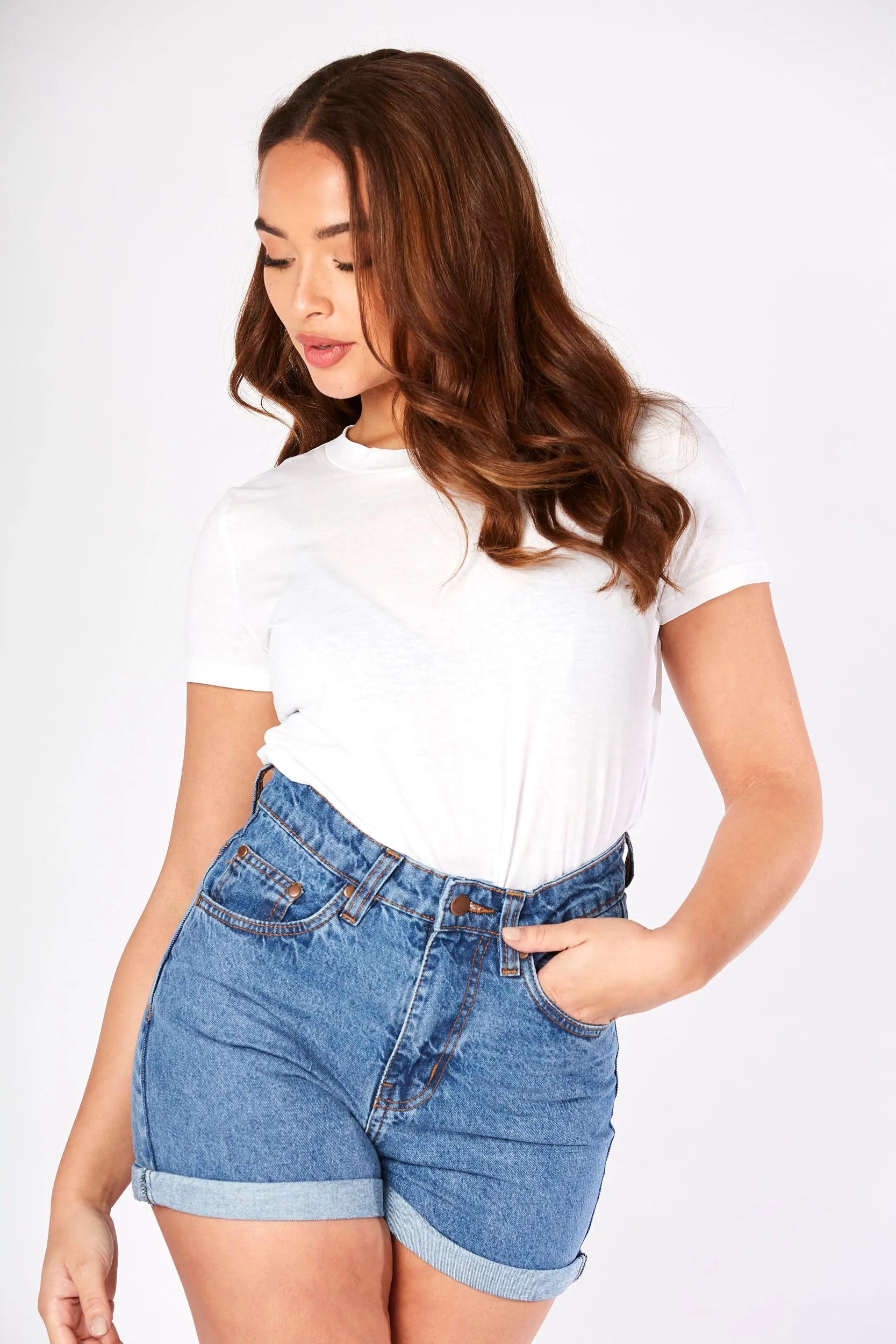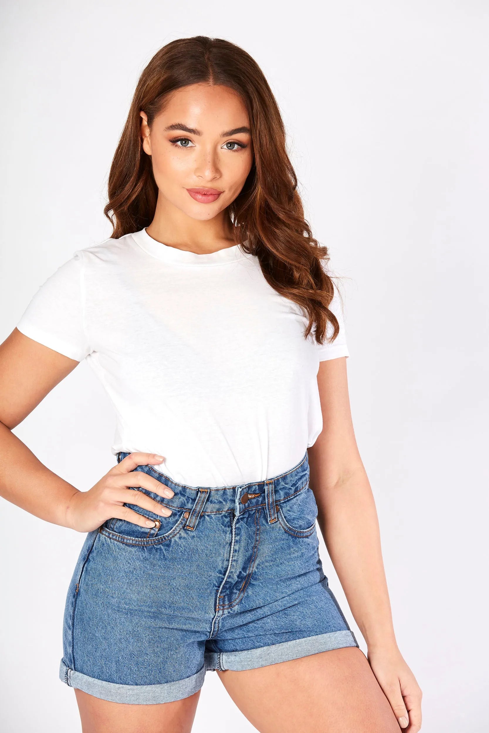 Meet your new go-to pair of shorts. Designed with a timeless high waist that flatters your figure, these shorts are crafted from classic mid-blue wash denim for a look that never goes out of style. The relaxed fit is finished with a smart turn-up hem for a casual, laid-back feel. Featuring a traditional five-pocket design and zip fly closure, they are the perfect foundation for all your simple tops and tees.