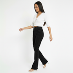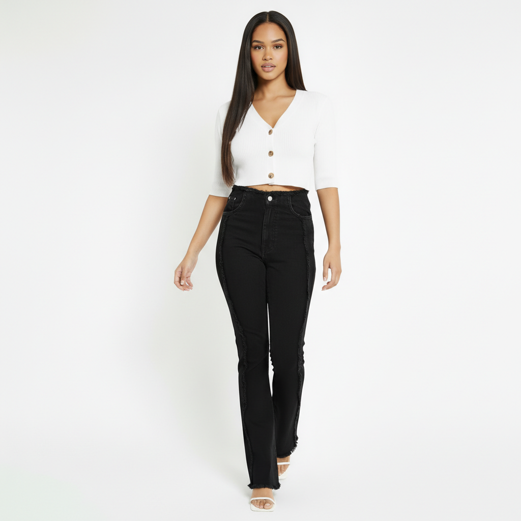 The ZEPHYRA Frayed Seam Bootcut Jeans in Black are the perfect way to spice up your weekend wardrobe. With a comfortable stretch denim fabric, they feature a unique frayed waistband and a front frayed seam for a touch of edge. The bootcut frayed hem is perfect for pairing with boots or heels, while internal adjusters ensure a staple fit.