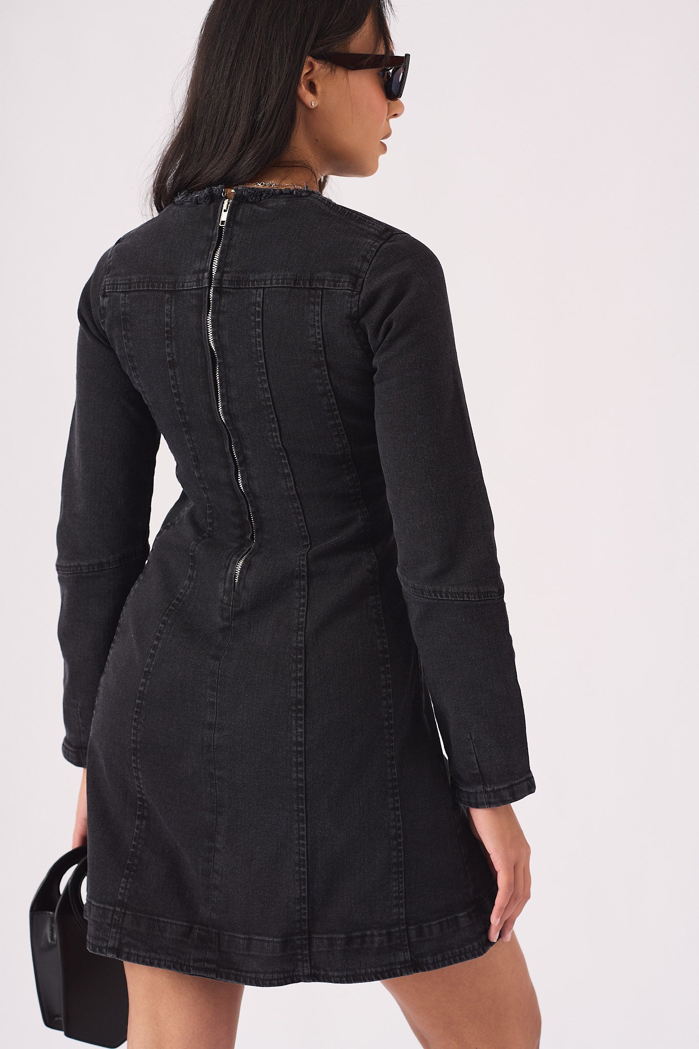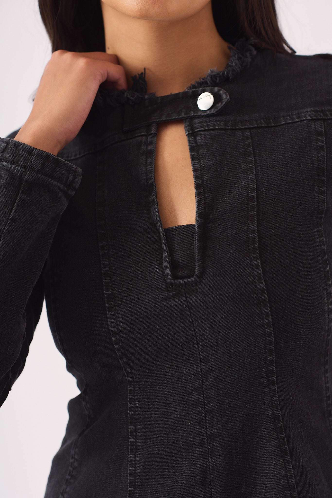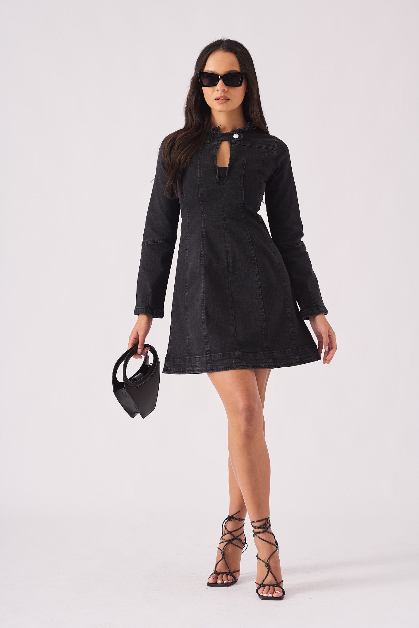 This black denim dress offers a modern take on a classic style. The flattering fit-and-flare silhouette is complemented by long sleeves and a unique keyhole neckline with frayed detailing. Crafted from durable cotton, it's a versatile piece perfect for any occasion.