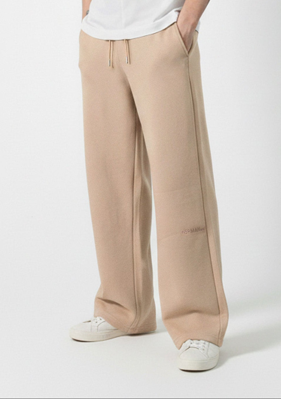 Expertly crafted to redefine loungewear, these joggers are a cornerstone of the modern wardrobe. The commanding wide leg silhouette offers a contemporary, relaxed fit, tailored from a premium brushback fabric for superior comfort. Presented in a versatile beige, the design is elevated with a clean pintuck seam down the front and subtle tonal embroidery. This is an essential piece for building a refined and effortlessly stylish look.