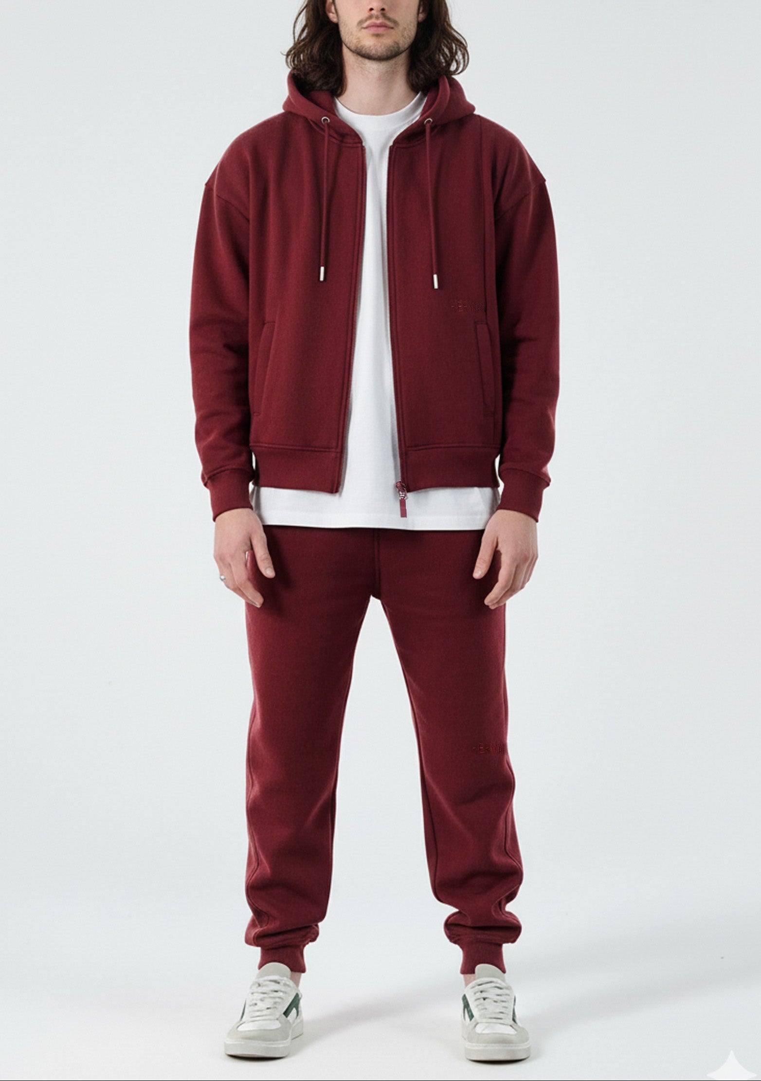 An essential redefined with a focus on fit and fabric, this zip up hoodie is a cornerstone for the modern wardrobe. The oversized silhouette creates a contemporary, relaxed profile, crafted from a premium brushback cotton blend for superior comfort and warmth. Presented in a rich burgundy hue and finished with minimalist tonal embroidery and polished metal hardware, it provides a versatile and elevated foundation for any curated look.