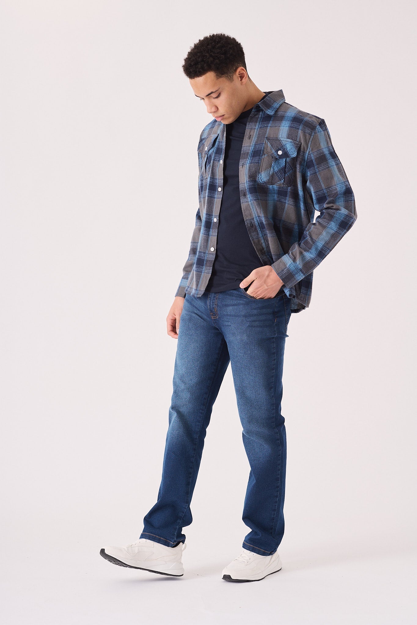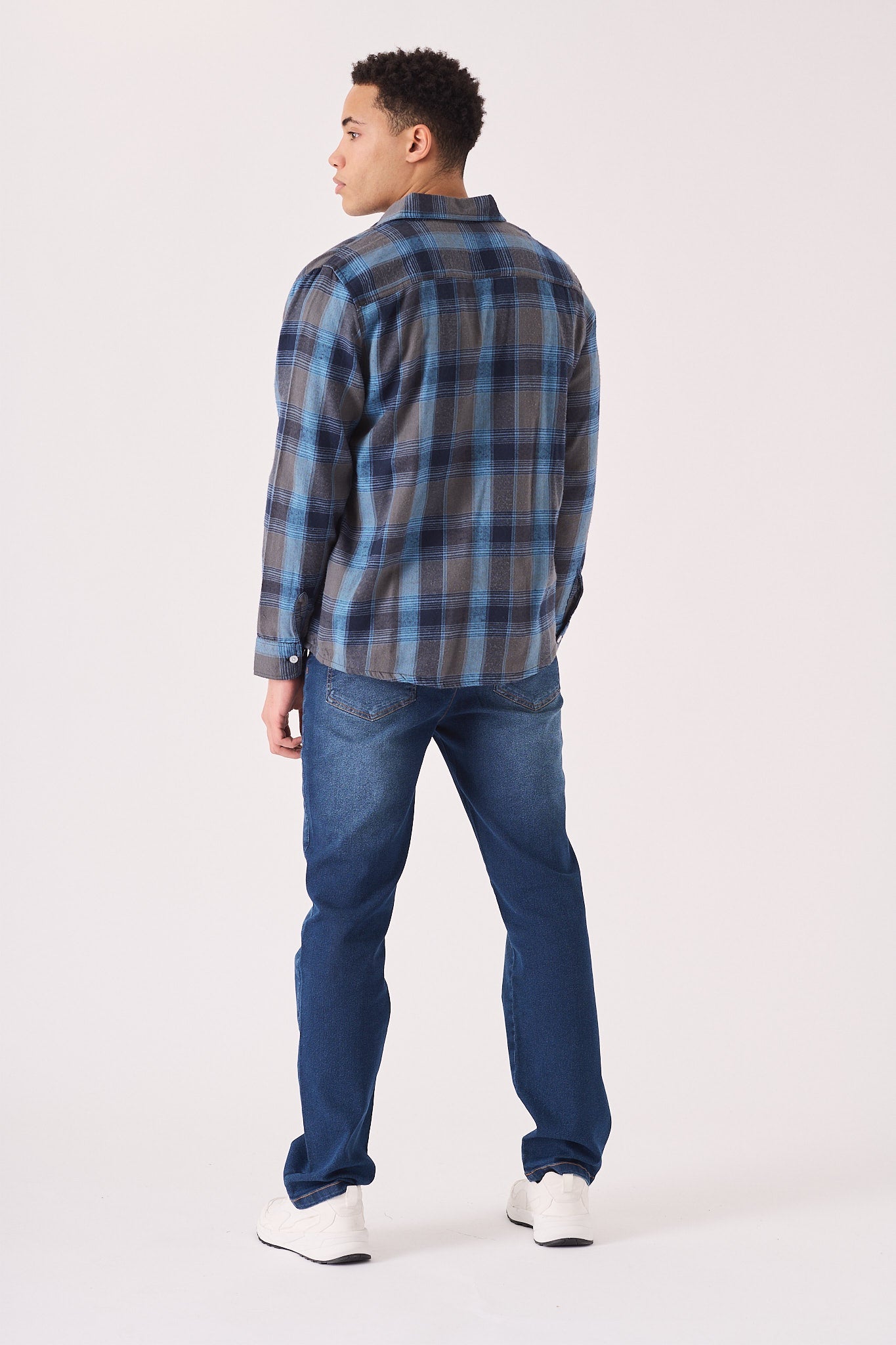 A timeless layer with a workwear-inspired aesthetic. Crafted from soft, brushed-cotton flannel in a classic blue and grey check. Engineered with practical snap button fastenings and two functional flap pockets.