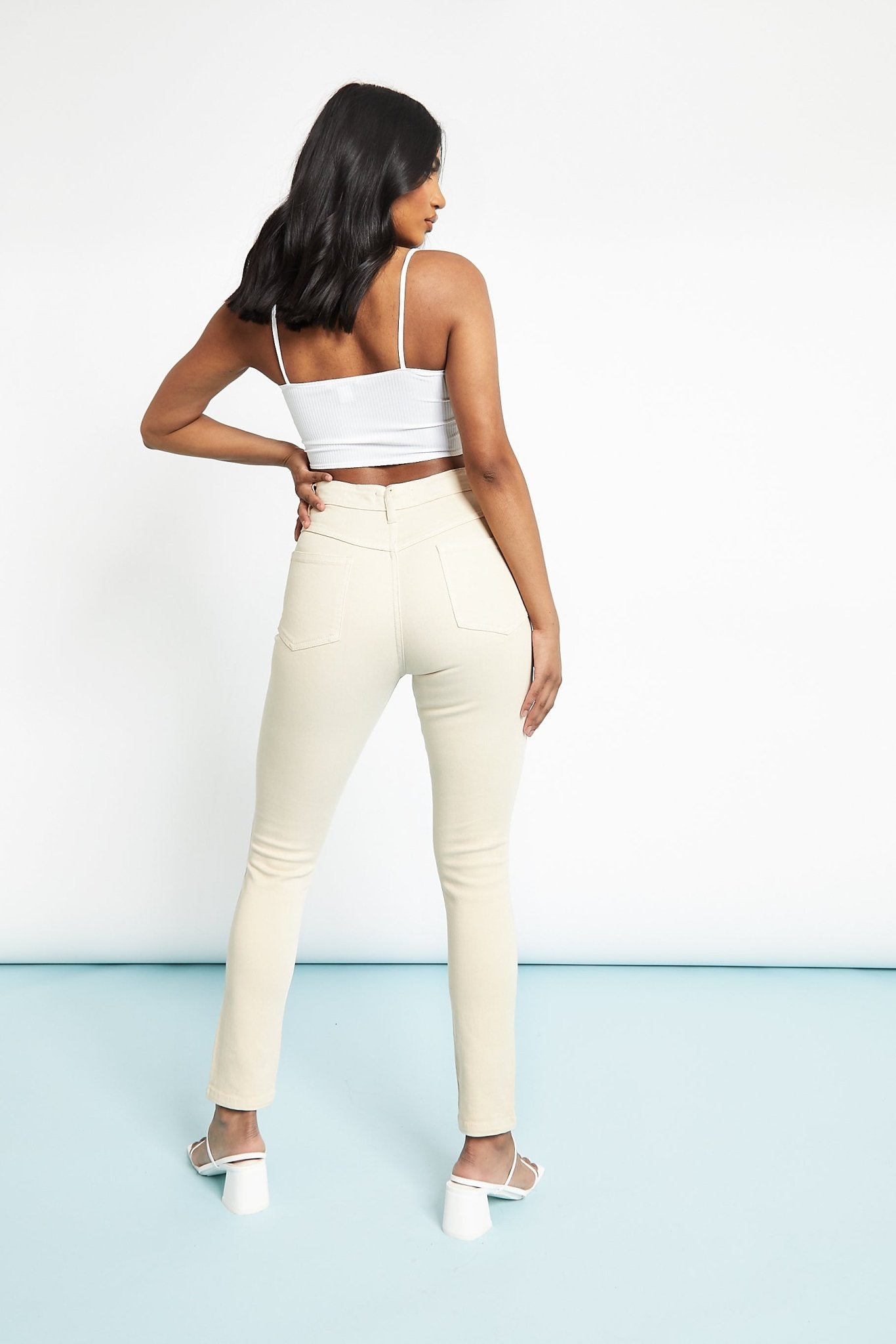 Sophisticated and versatile, the Monja High Rise Skinny Jeans in ecru offer endless styling possibilities. The neutral tone pairs beautifully with both bold colors and soft pastels, while the stretch fabric ensures comfortable movement throughout your day. Create monochromatic looks with cream knits or add contrast with navy blazers. Available in sizes 6 - 18 in Regular and Plus.