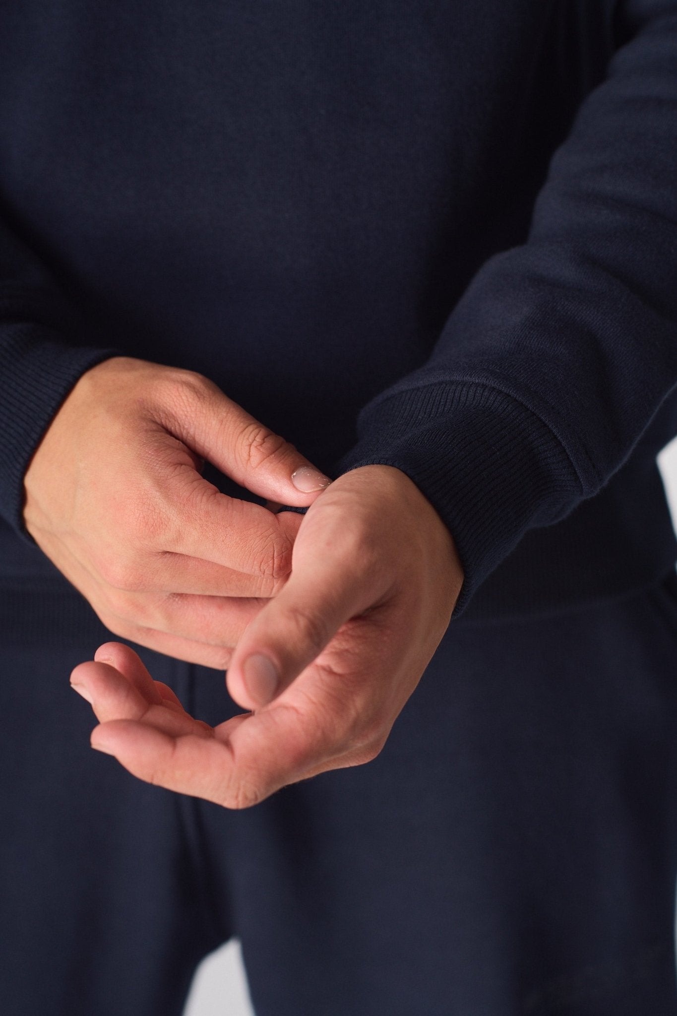 Refined, minimalist design. Crafted from exceptionally soft, cotton-blend fleece in a versatile navy. Finished with a subtle, tonal embroidered slogan for an understated, premium look.
