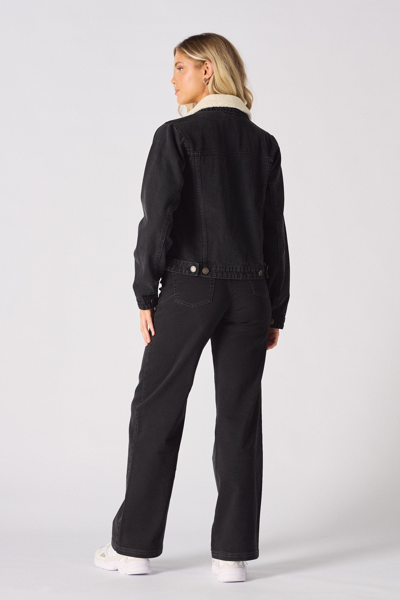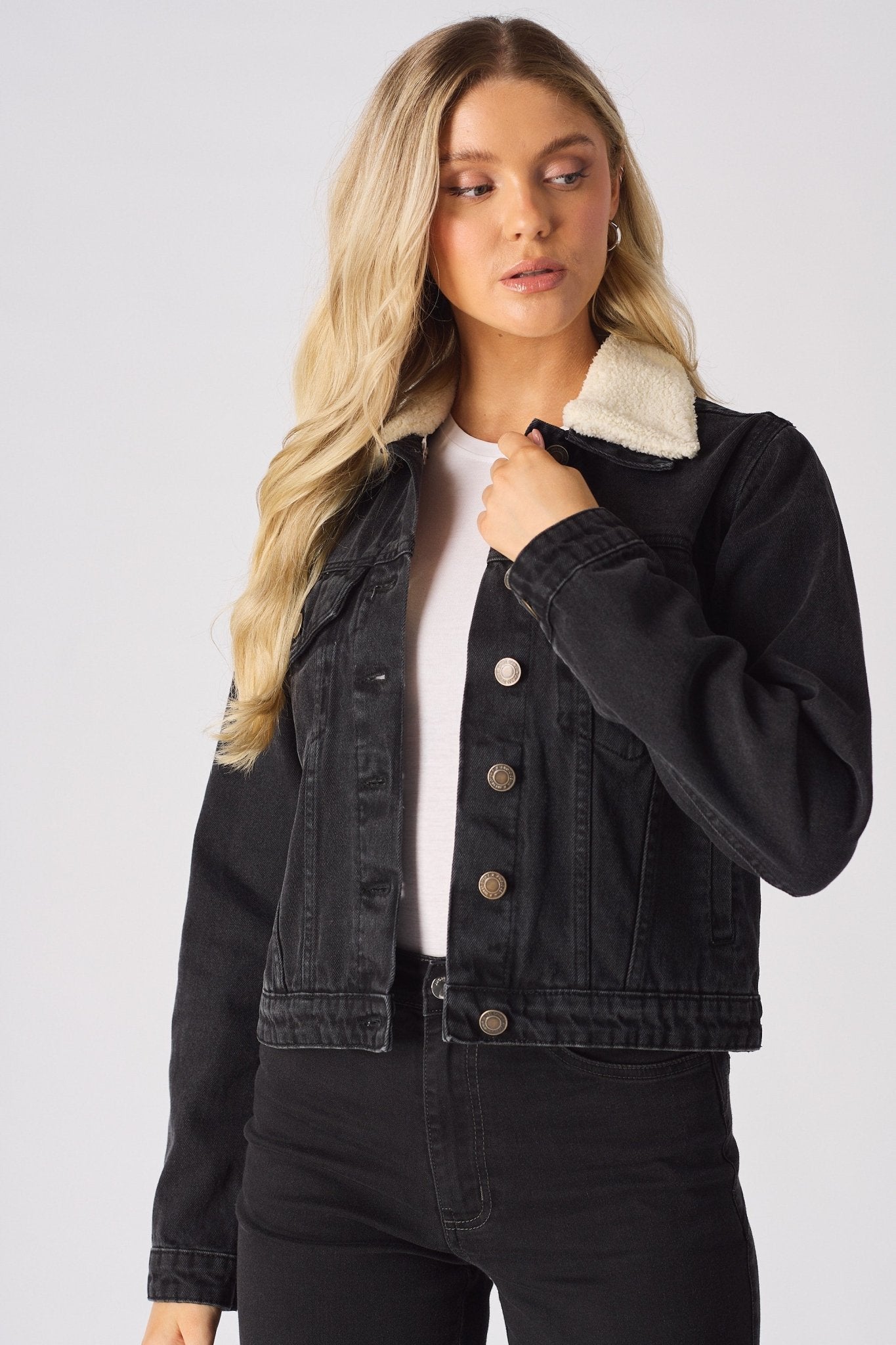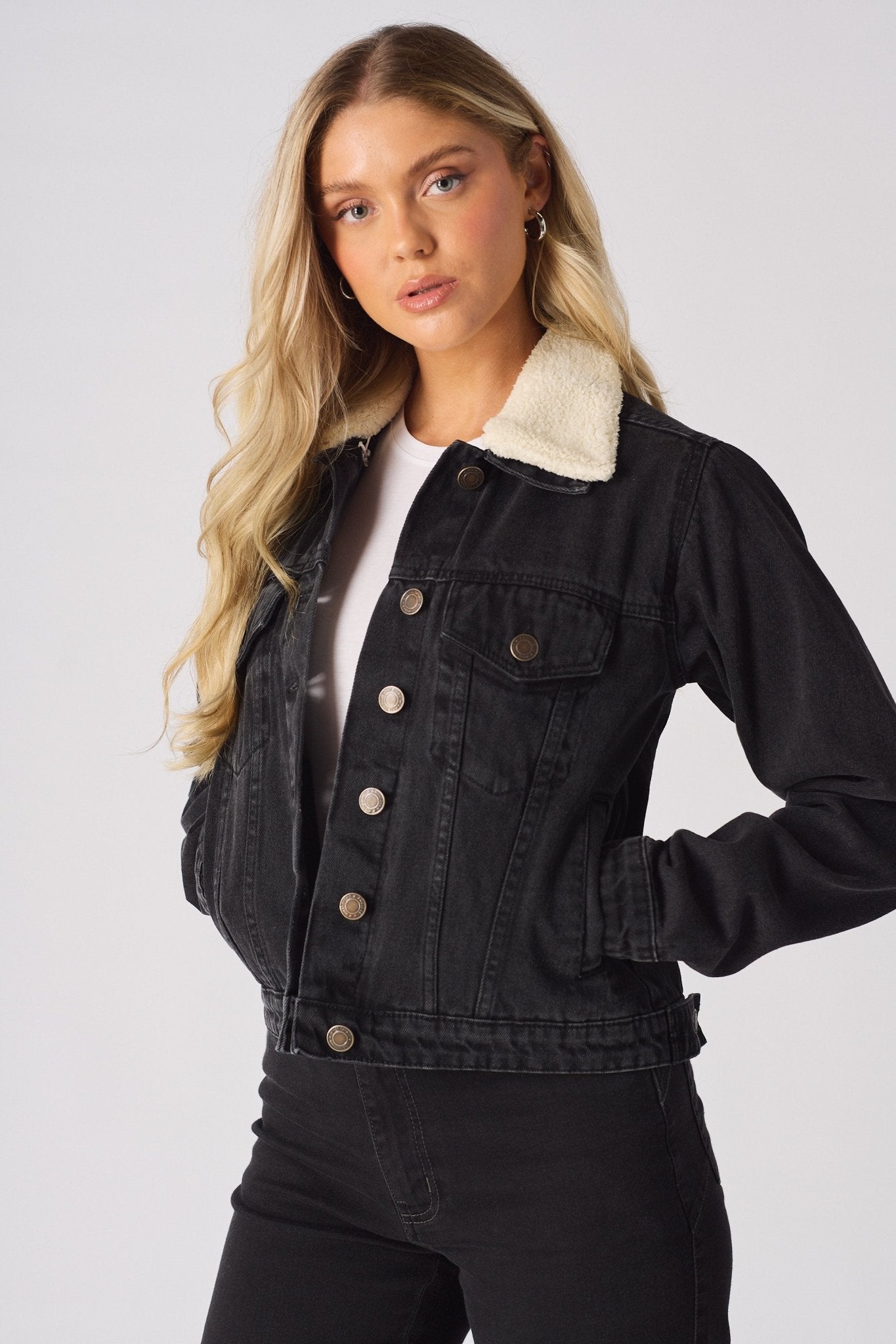 Zoom Drift Sherpa Collar Denim Jacket – Black - JMOJO - Women's Denim Jackets Sherpa