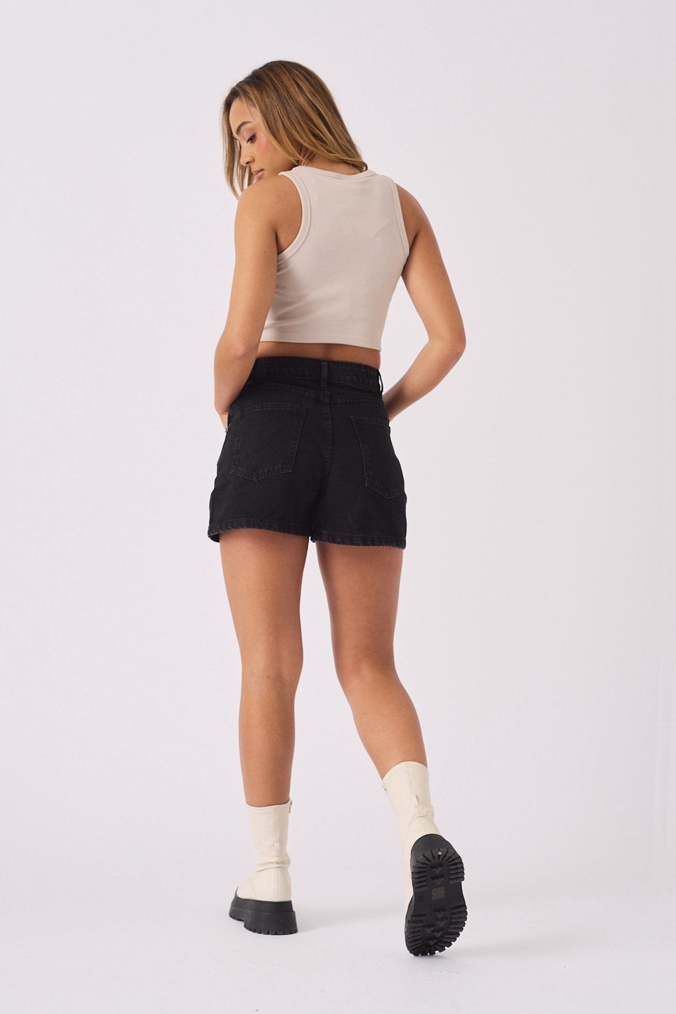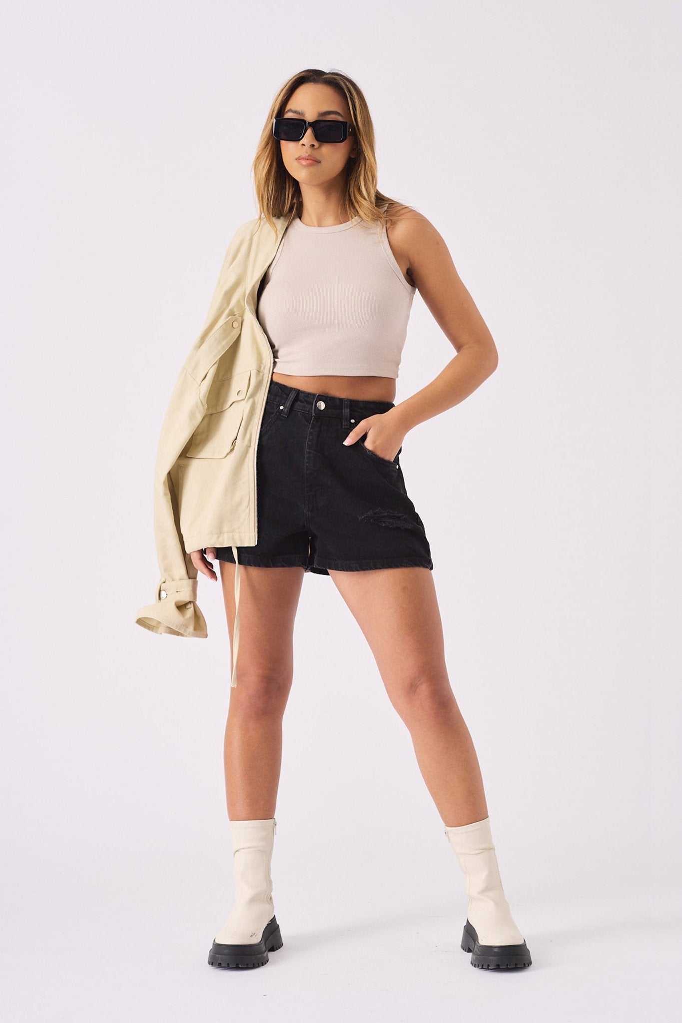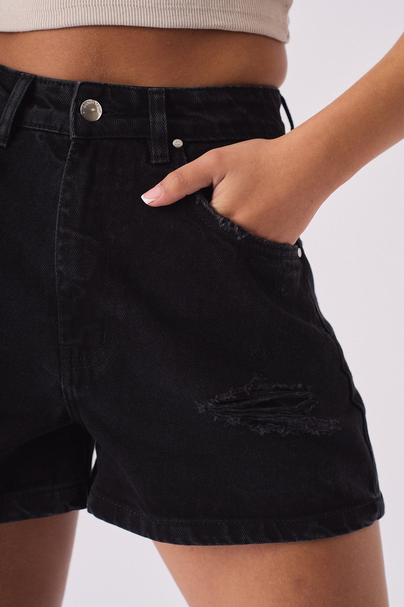 An essential for any wardrobe, these high-waisted denim shorts offer a perfect blend of classic style and modern edge. Crafted from washed black denim, they feature subtle ripped and distressed details for an authentic, laid-back look. The flattering high-waisted silhouette ensures a comfortable fit, while the five-pocket design and belt loops maintain a timeless appeal. These shorts are a versatile foundation for countless casual outfits.