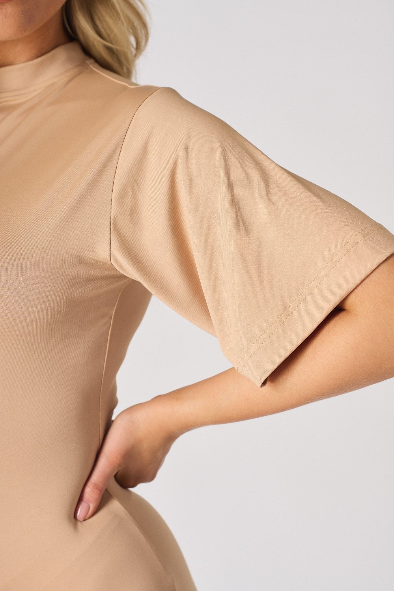 Introducing our Ruched Detail Short Sleeve Mini Dress in Beige, a chic and versatile addition to your wardrobe. This mini dress features elegant ruched drape details, a classic crew neckline, and short sleeves for a blend of modesty and allure. The slim fit offers a flattering silhouette and comfort, while the mini length adds a contemporary charm. Durable and flexible, this dress is perfect for various occasions, from casual outings to special events.