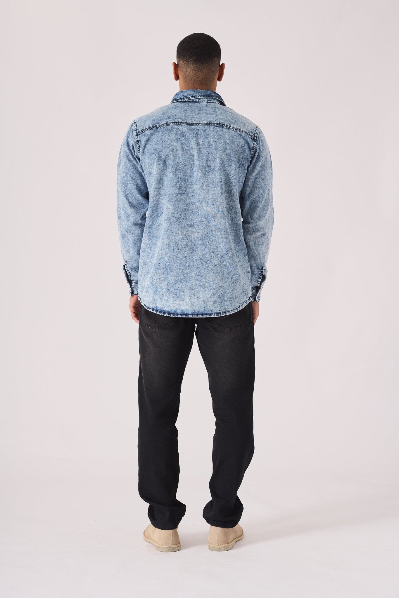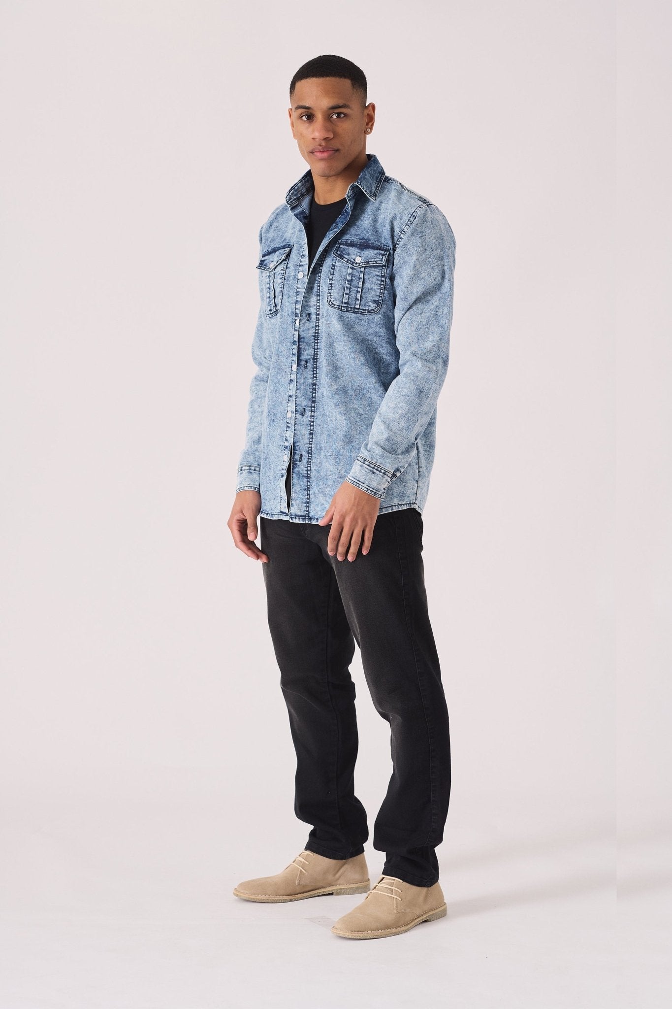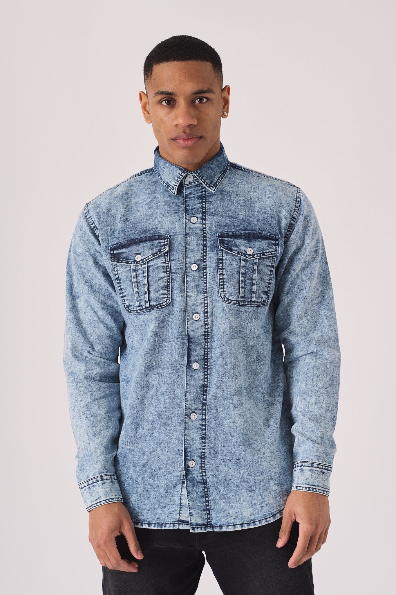 This acid wash denim shirt offers a distinct, vintage-inspired look. Crafted from pure cotton, it's cut in a slim fit and features a classic button front and two chest pockets. It's a versatile piece that adds character to any casual outfit, perfect for layering or wearing on its own.