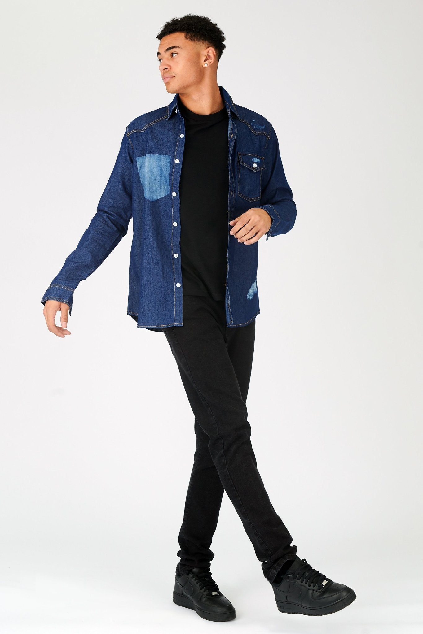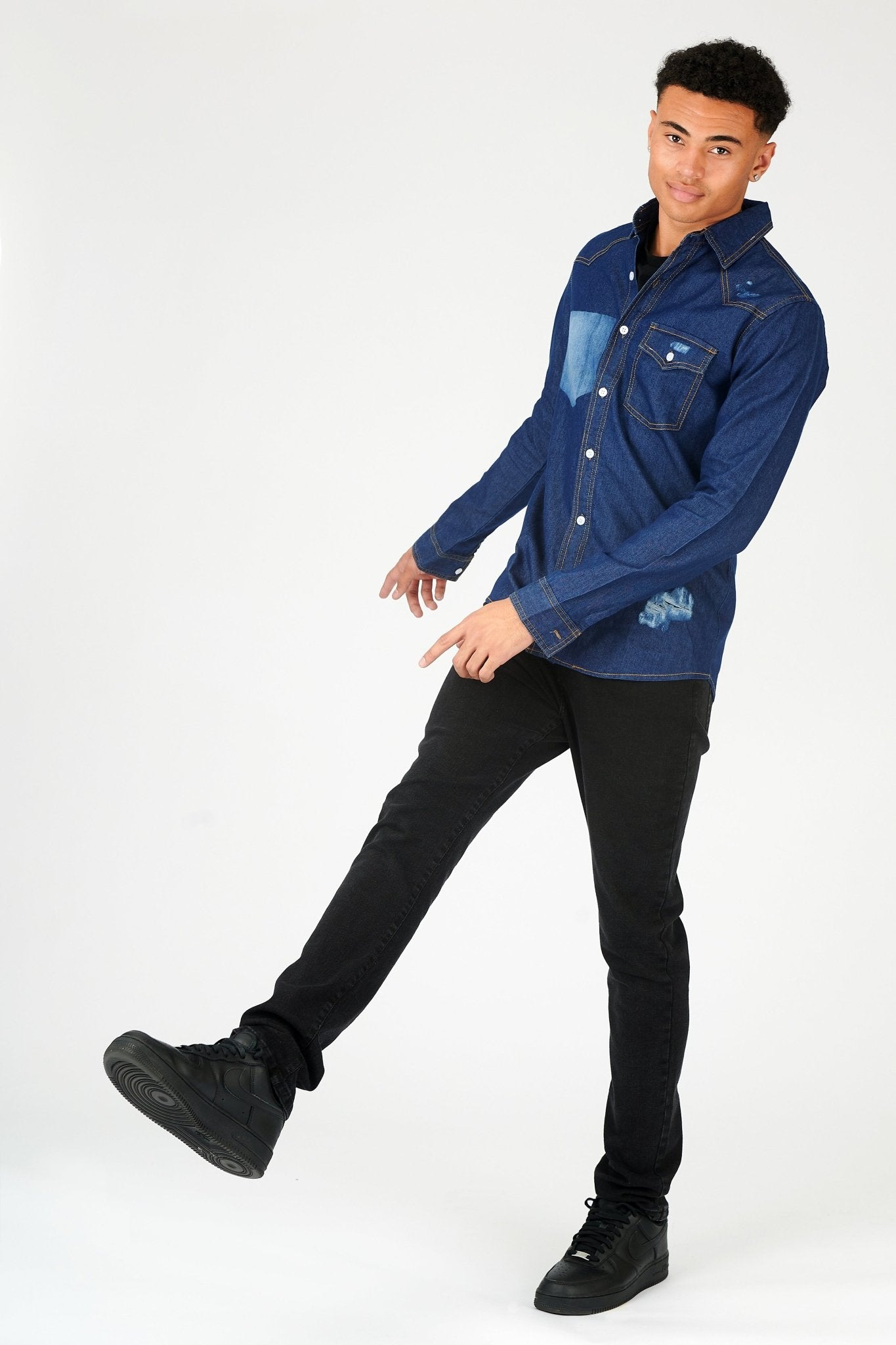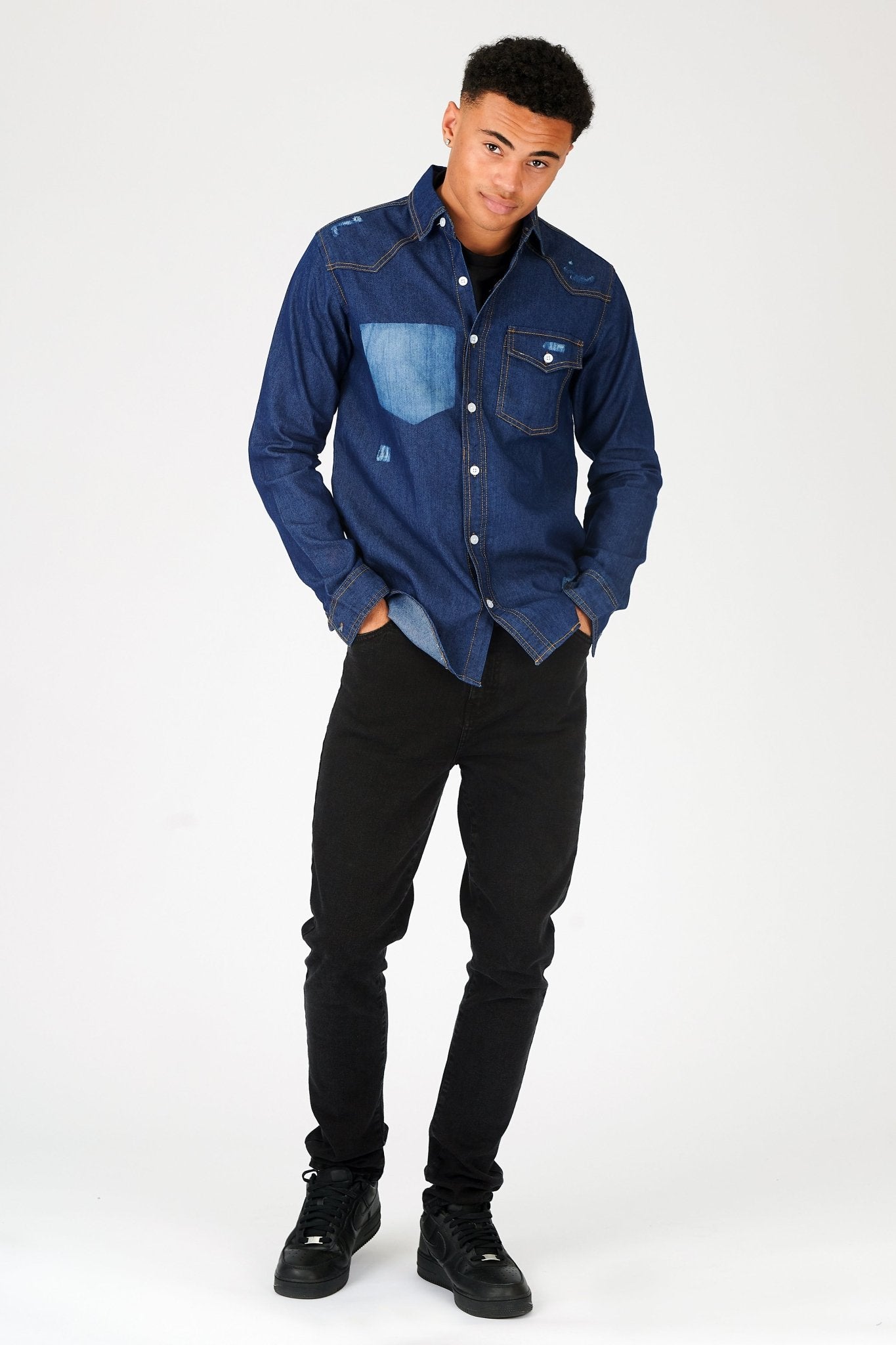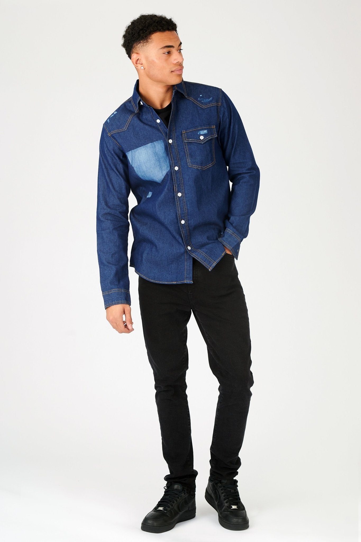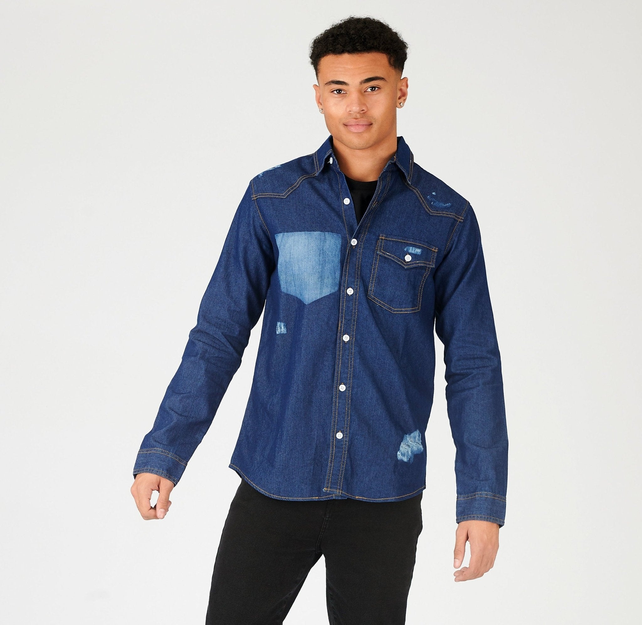 Zoom SLIM FIT DISTRESSED DENIM SHIRT - SHADED INDIGO BLUE - JMOJO - Men's Denim Shirts