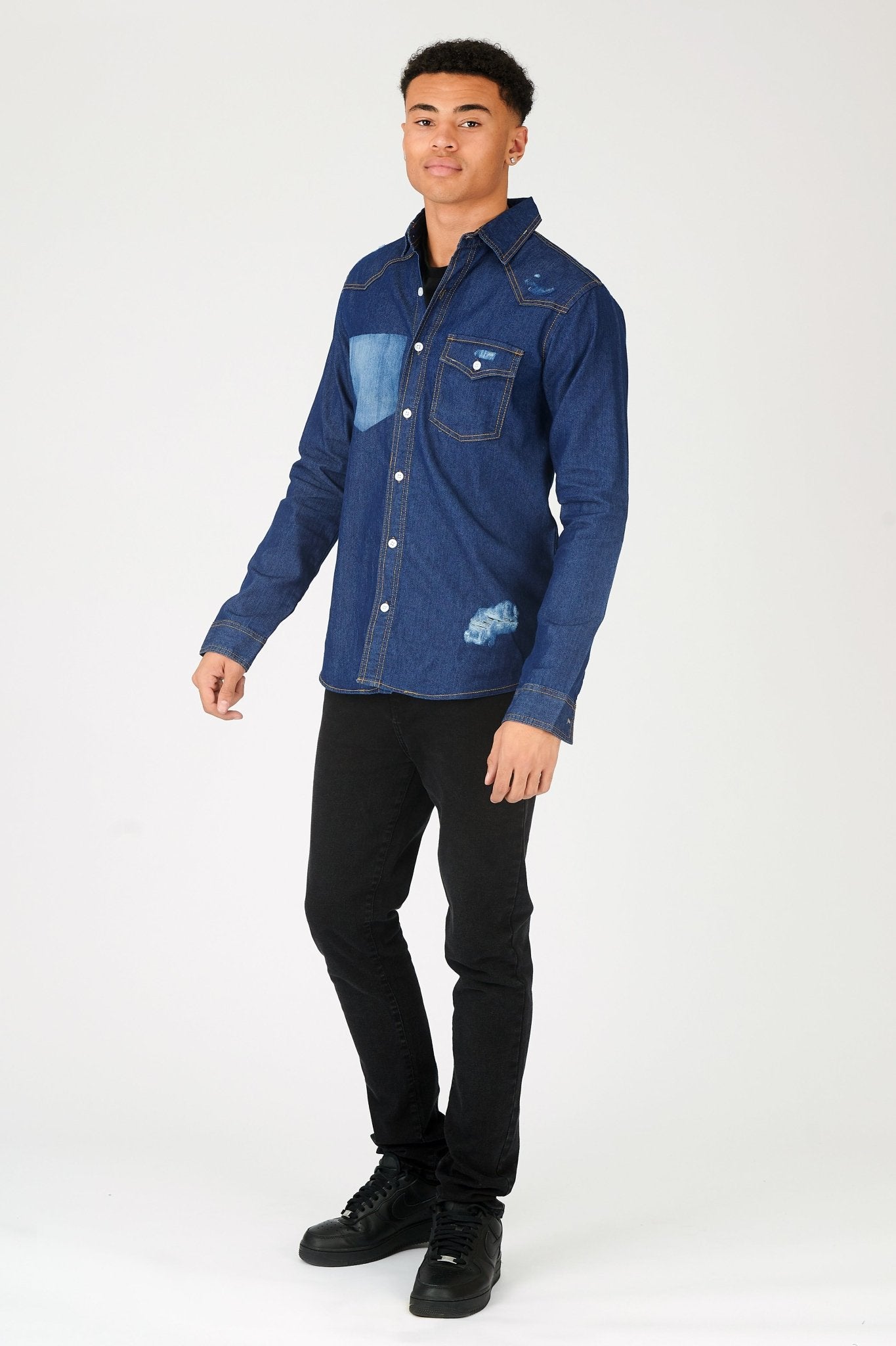 SLIM FIT DISTRESSED DENIM SHIRT - SHADED INDIGO BLUE