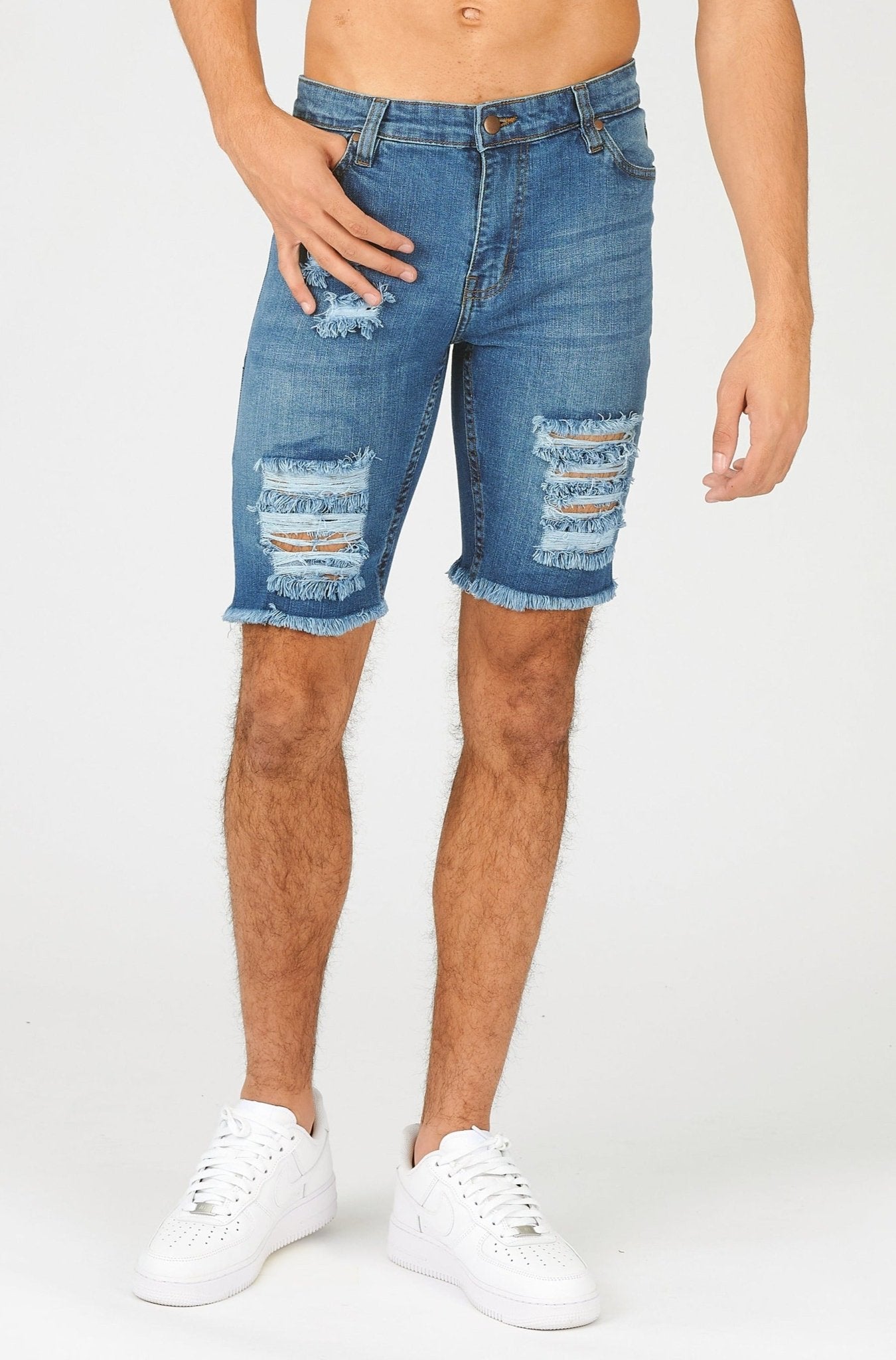 A bold, worn-in look. Cut for a modern slim fit in a classic light blue wash. Engineered with heavy distressing and frayed hems from soft, stretch-infused denim for a sharp, comfortable silhouette.