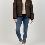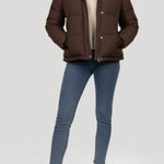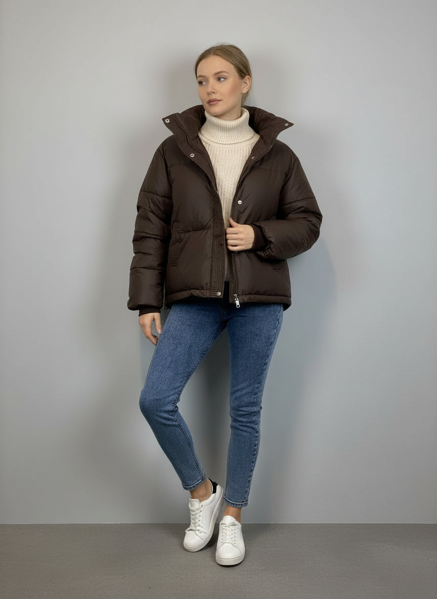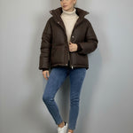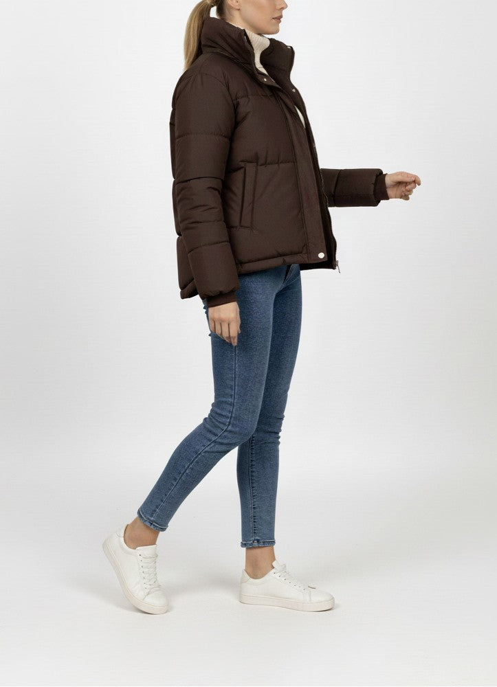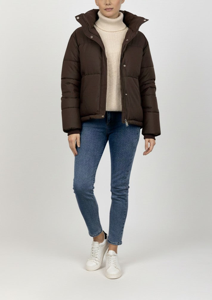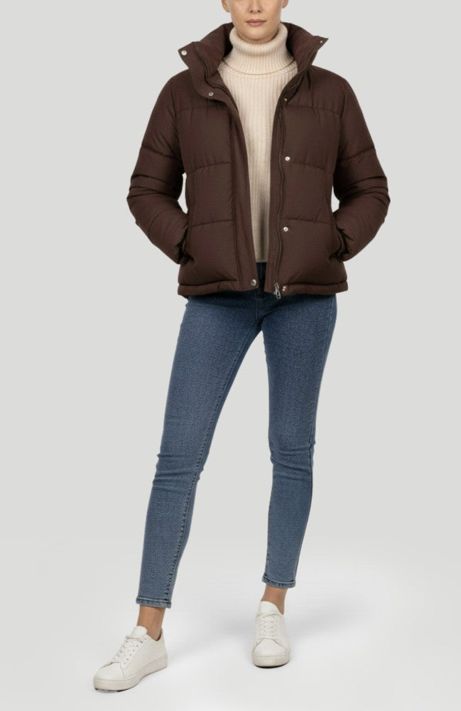 Stay protected from the elements in this essential brown puffer jacket. Its waterproof and windbreaker design offers practical warmth, while the classic padded style provides timeless appeal. Featuring a high neck and a secure zip and popper fastening, it's the perfect go to coat for any outing.
