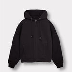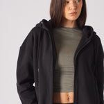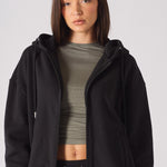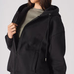 Our premium Women's black zip-up hoodie is a true wardrobe staple. It's made from quality polycotton that's extra soft and features a tonal zipper opening, brushback quality, and seam detailing for a stylish look. Plus, its unisex hoodie design makes it an excellent option for both men and women. It is a slightly oversized and drop-shoulder design that ensures comfort to the wearer.
