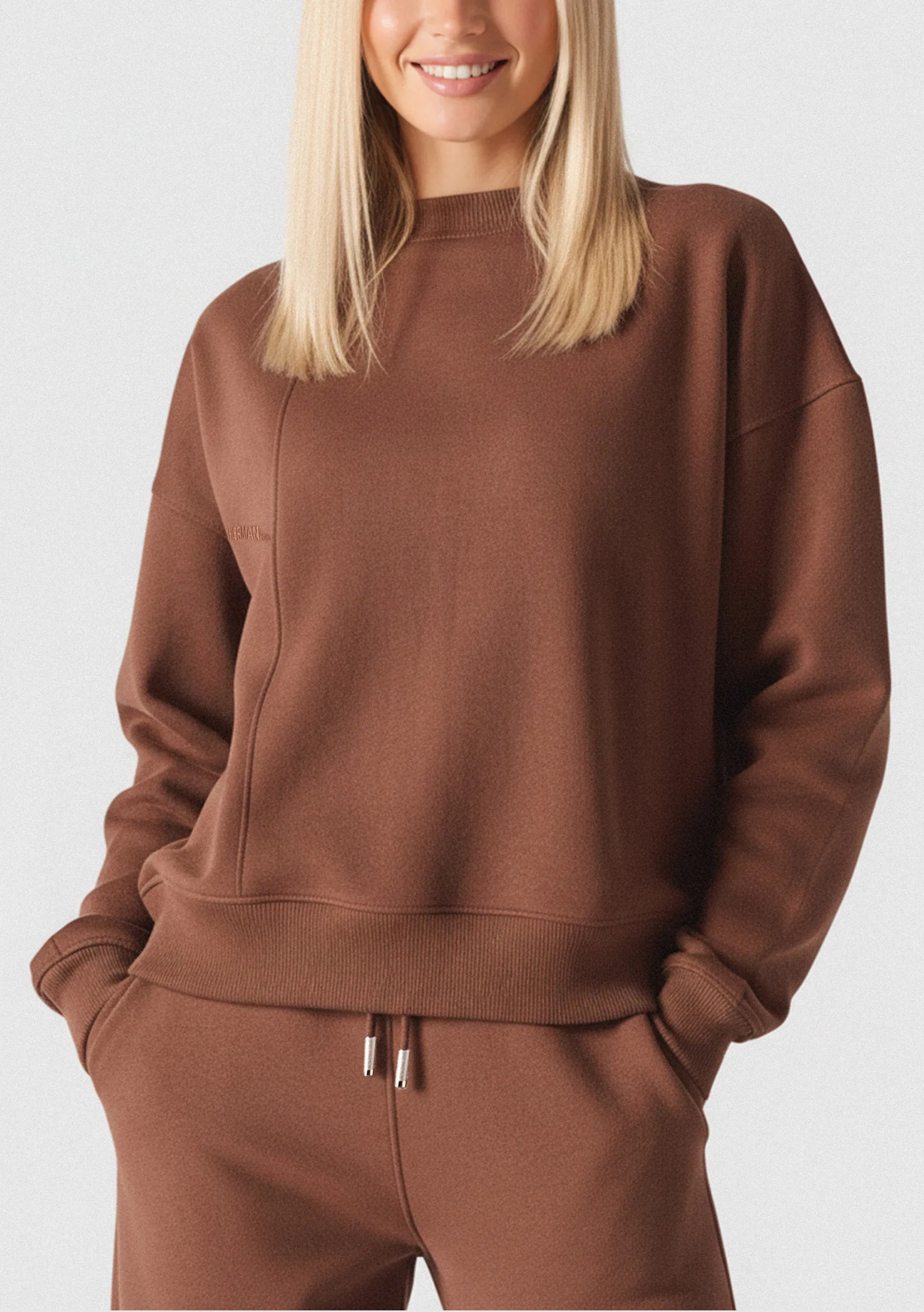A study in minimalist design, this sweatshirt is presented in a rich, sumptuous brown. Its deliberately oversized silhouette is defined by architectural seam detailing, creating a refined staple for an elevated, contemporary wardrobe.