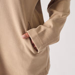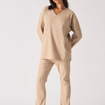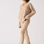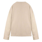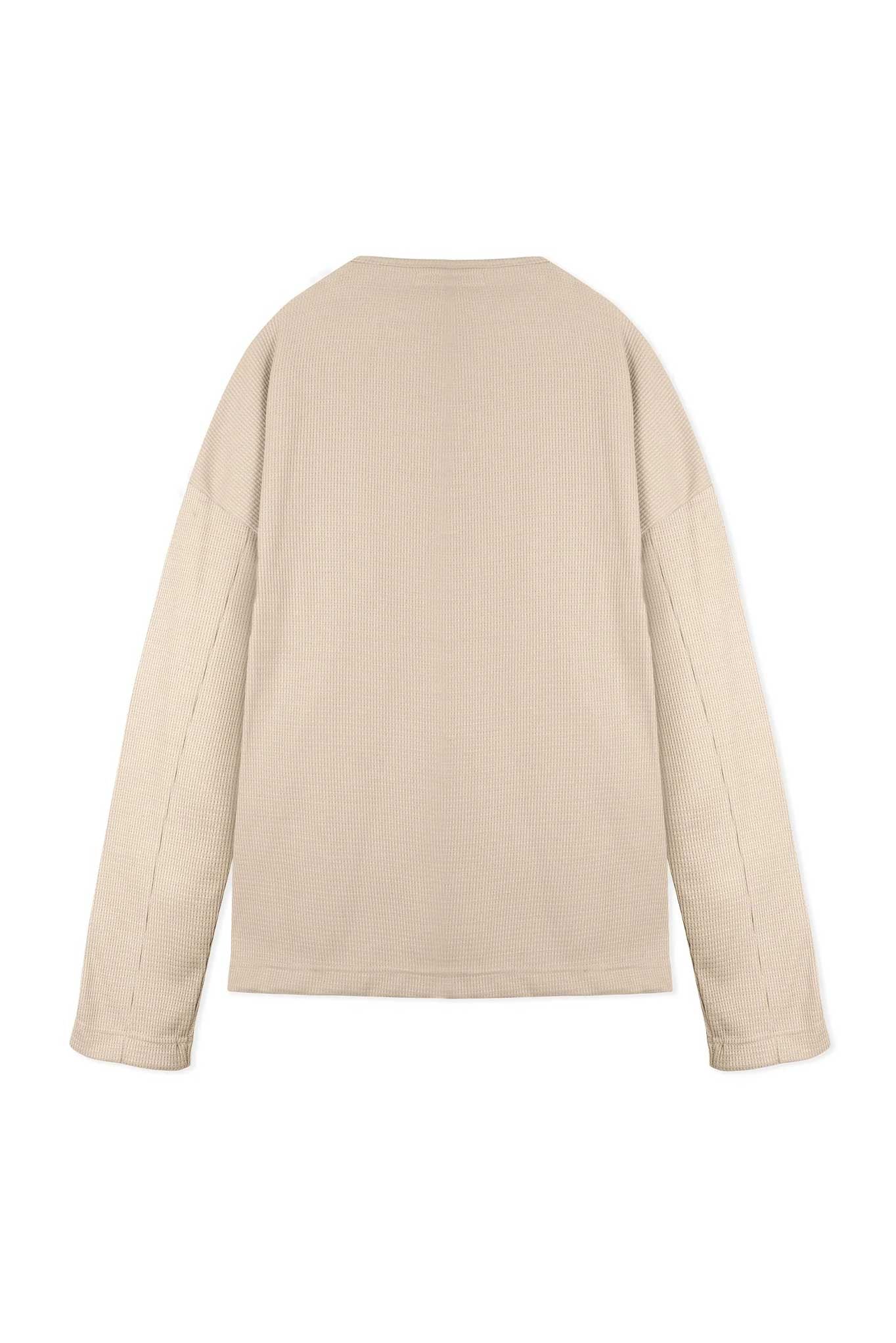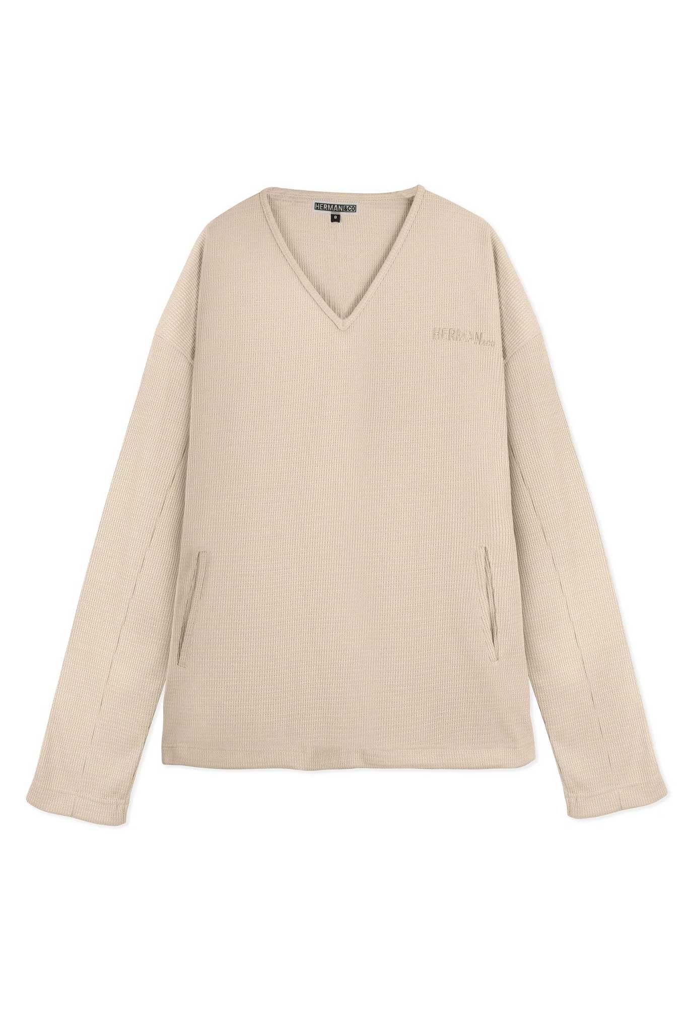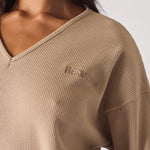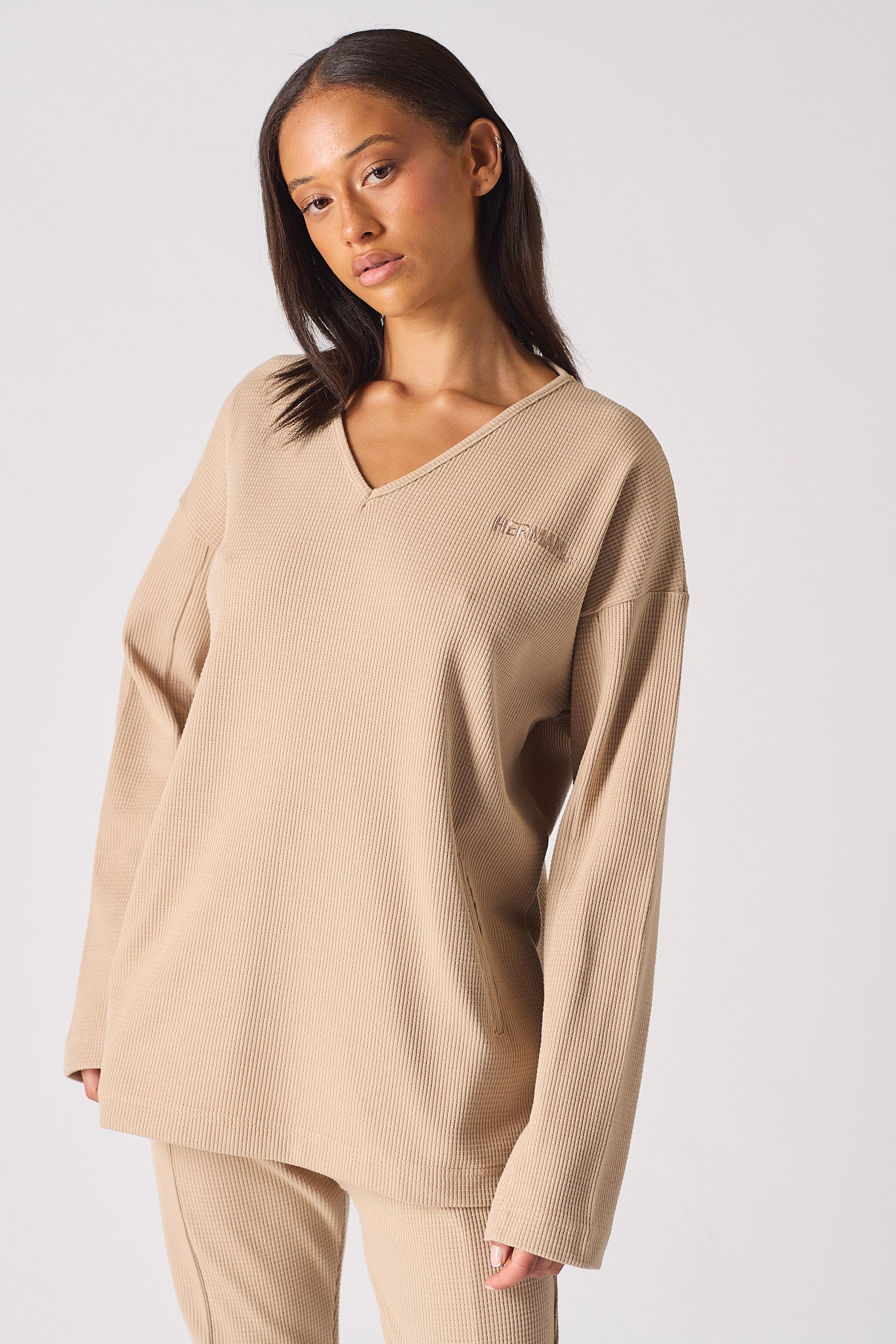 Inject some neutral tones into your luxury wardrobe with this v-neck jumper, ideal for anyone who wants to stay on trend this season. This oversized jumper is made with quality waffle polyester that's designed for comfort and a flattering look. It features a v-neck fit, slip welt pocket seam detail to the front and back of the arm, and drop shoulder. Whether you wear it with joggers or jeans, this beige v-neck women's jumper is sure to become one of your favourite go-to pieces!
