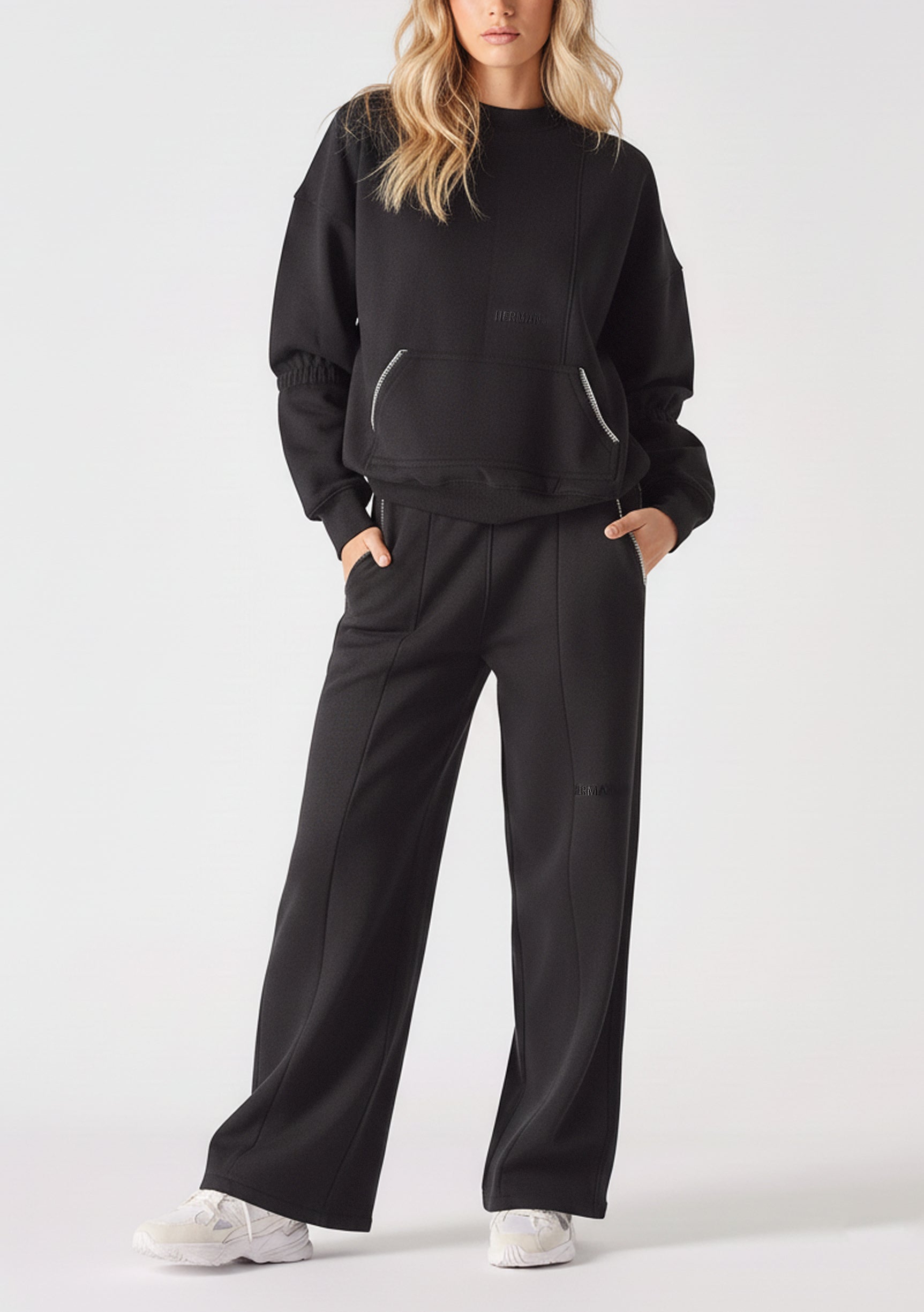 - Crew neckline and kangaroo pocket with contrast blanket stitching